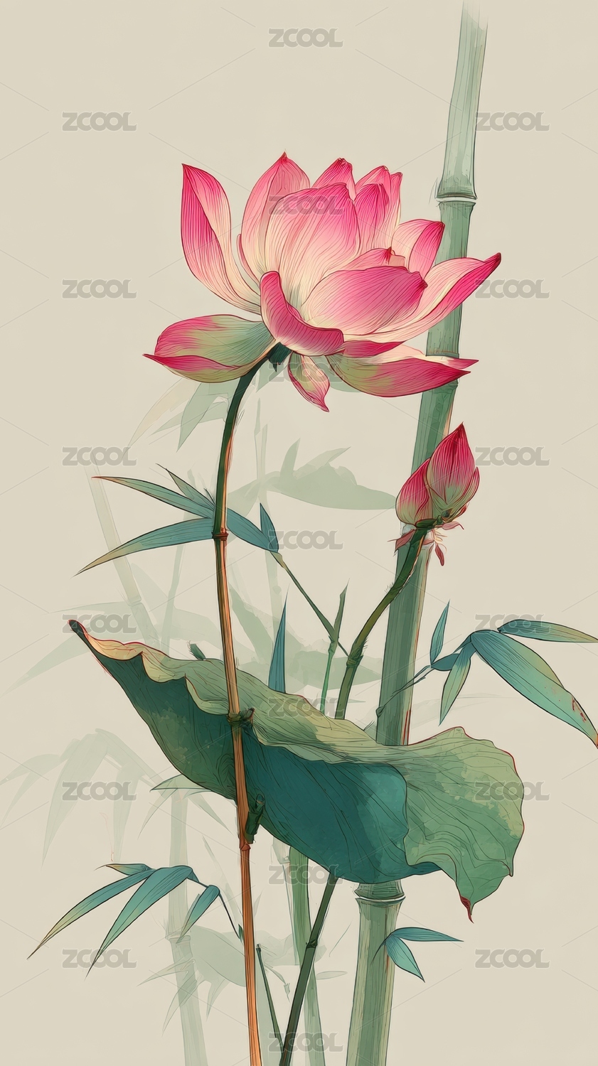 自然,清新,和谐,竹子,背景,艺术,绘画,莲花,粉色,静谧