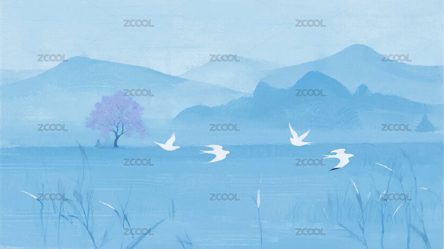 飞鸟,旷野,山脉,蓝调,风景,插画,矢量,自然,宁静,清新