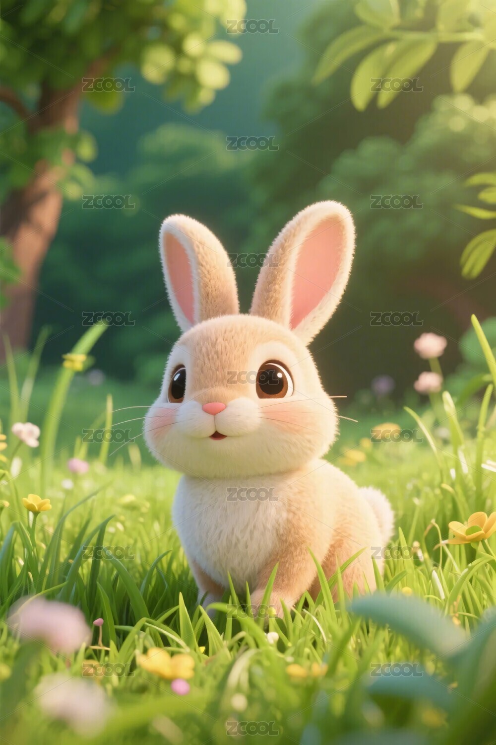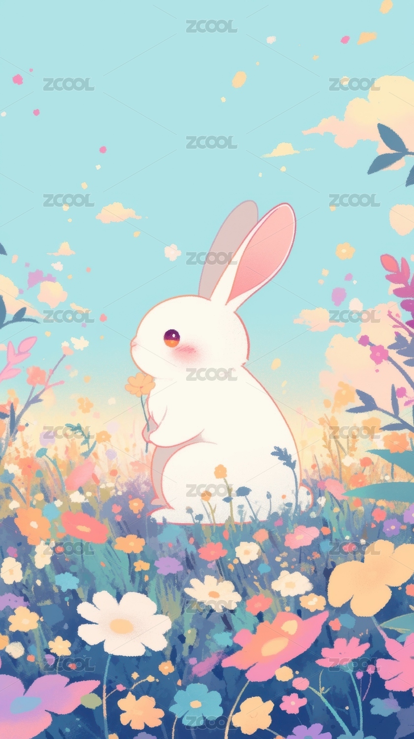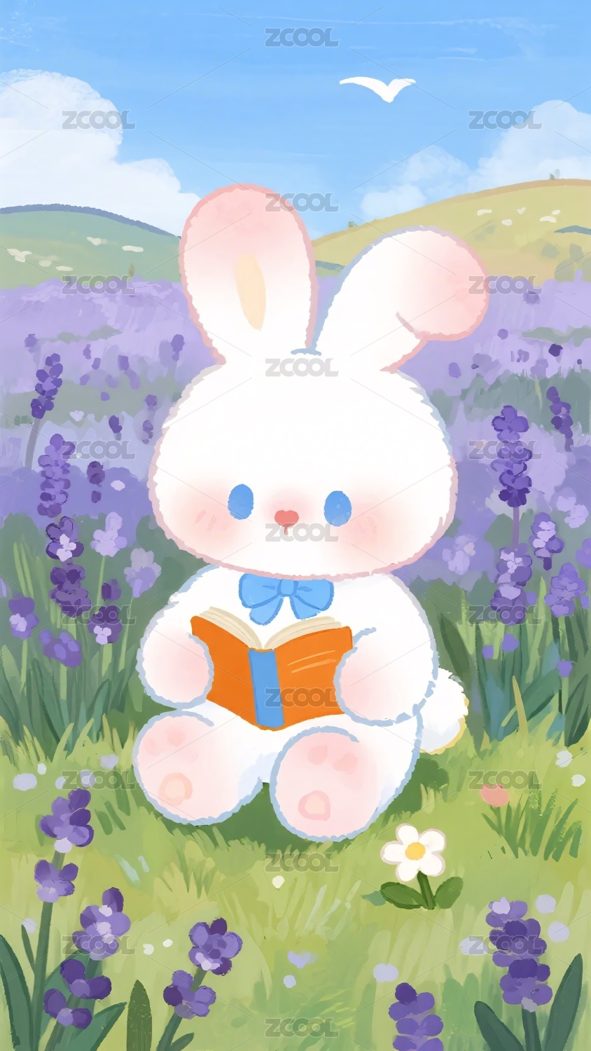 白兔,薰衣草,草地,蓝天,白云,插画,卡通,可爱,田园,自然