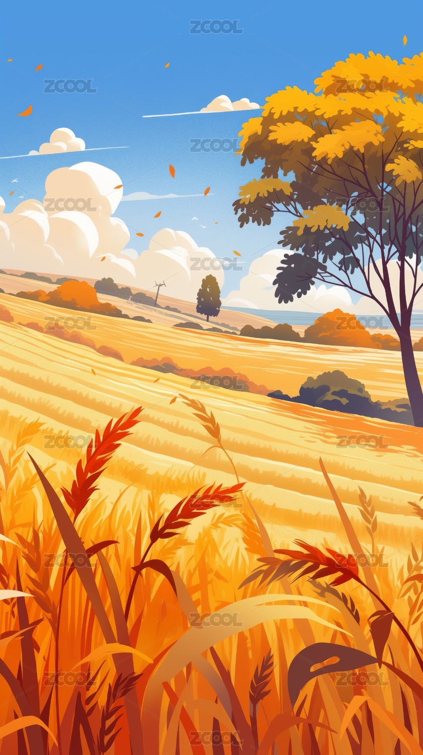 夏天晴朗天空下成熟的金黄色麦田插画绘画
