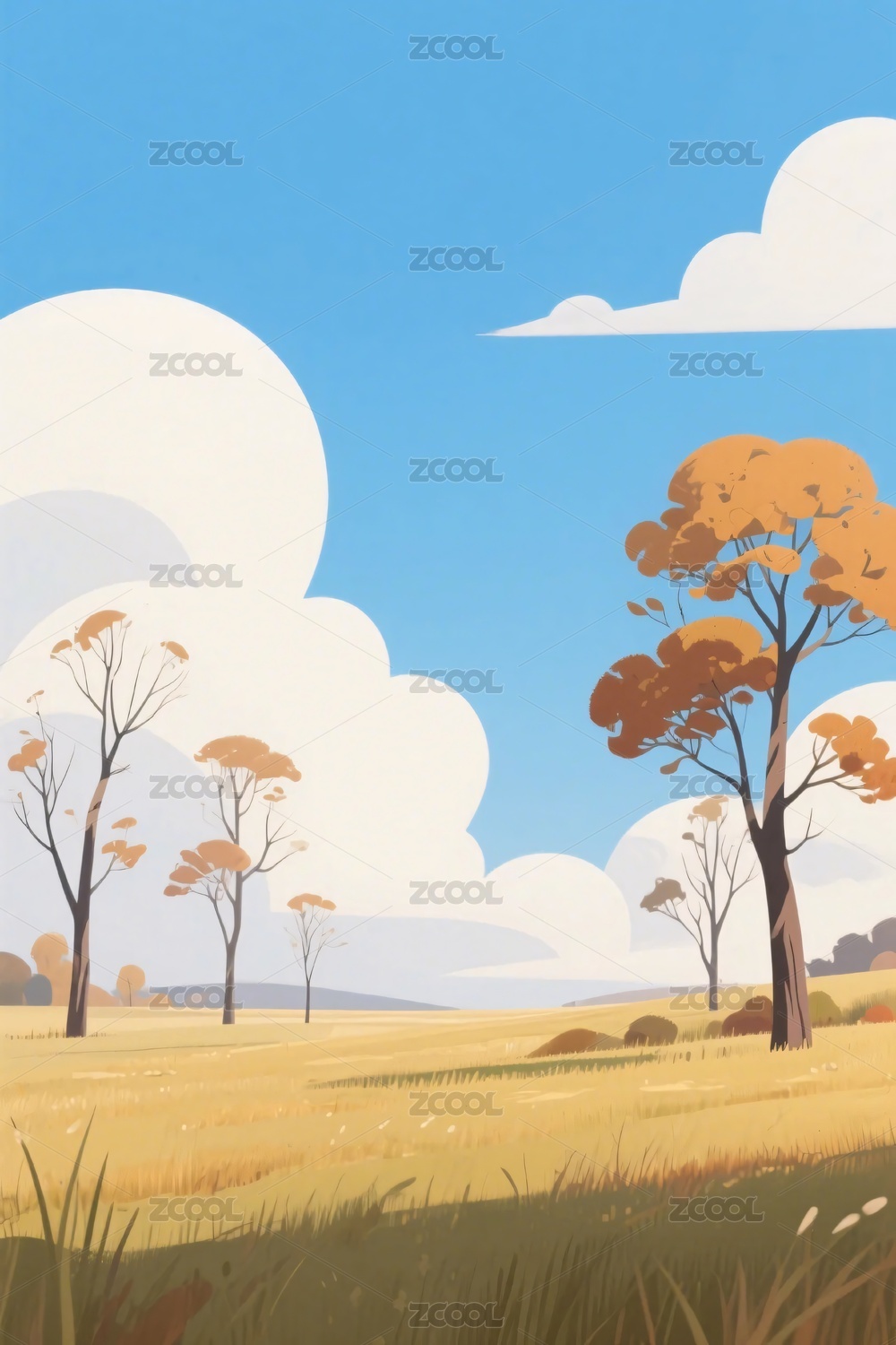 大树,果实,田野,蓝天,白云,山丘,插画,风景,自然,田园