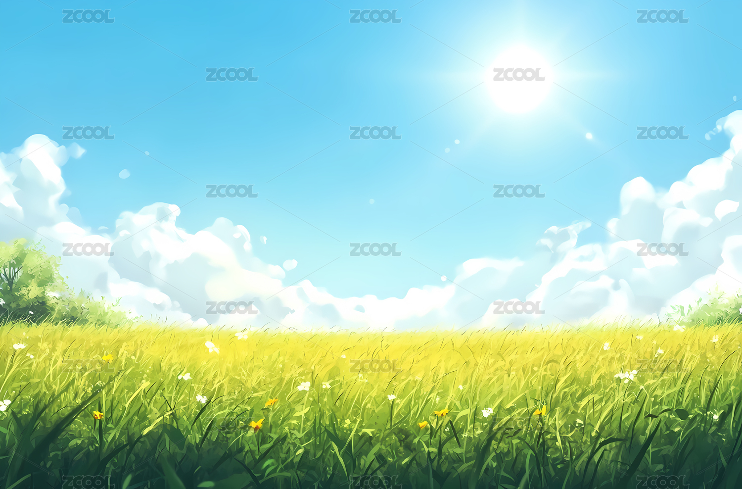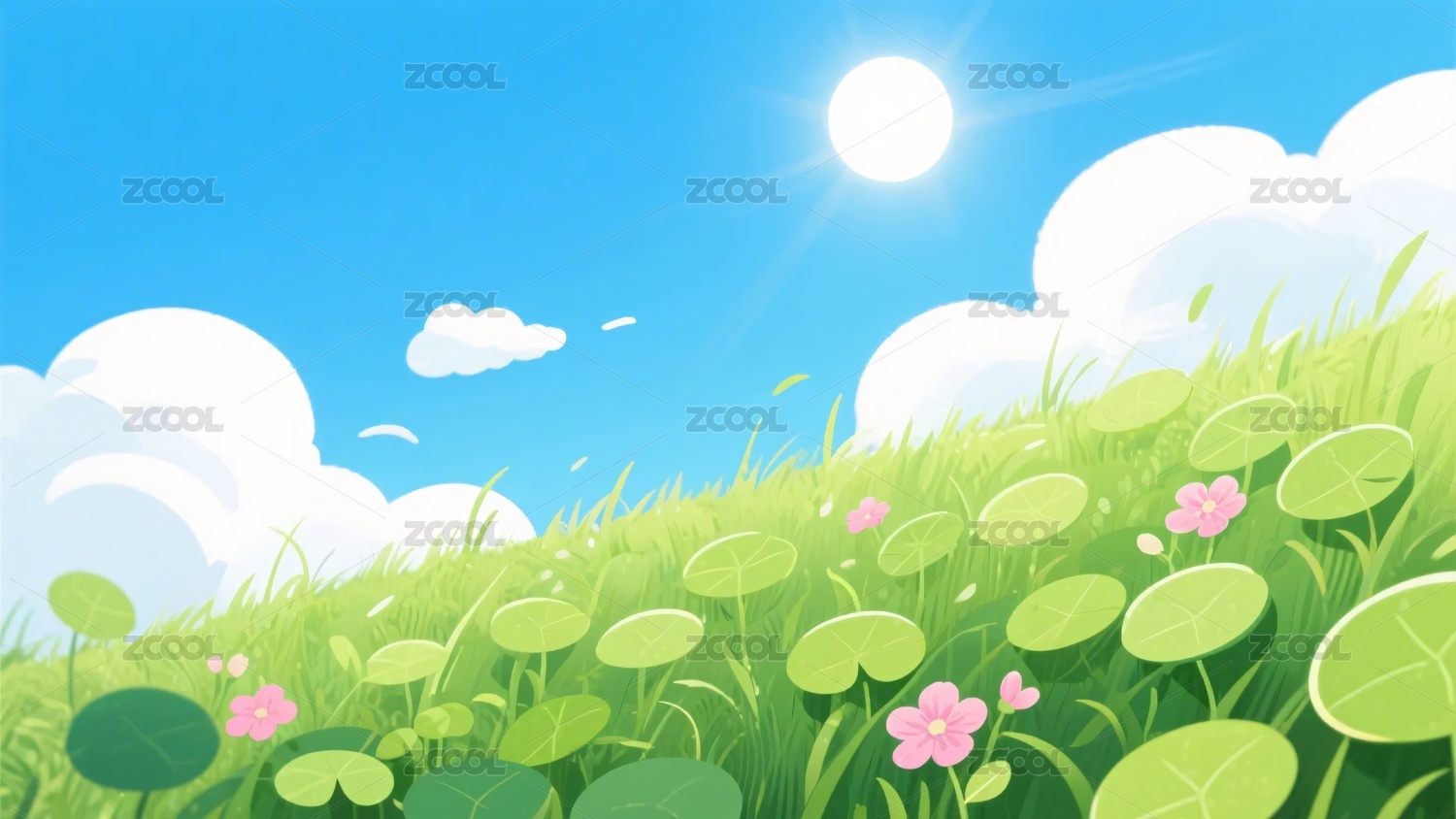 草地,花朵,太阳,白云,蓝天,插画,风景,自然,清新,矢量