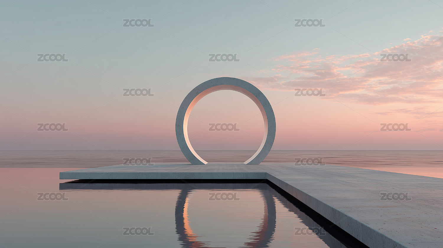 环形雕塑海边日落景象