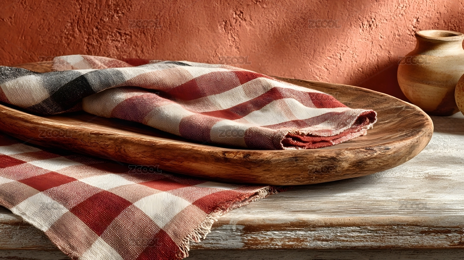 红白格子布与木盘组合
