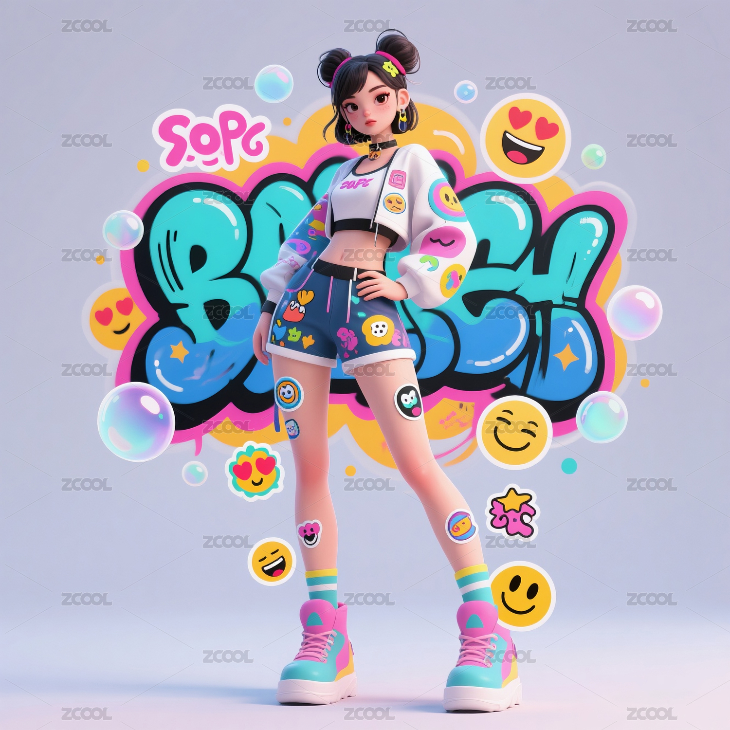 涂鸦与表情符号混合的前卫潮服美少女