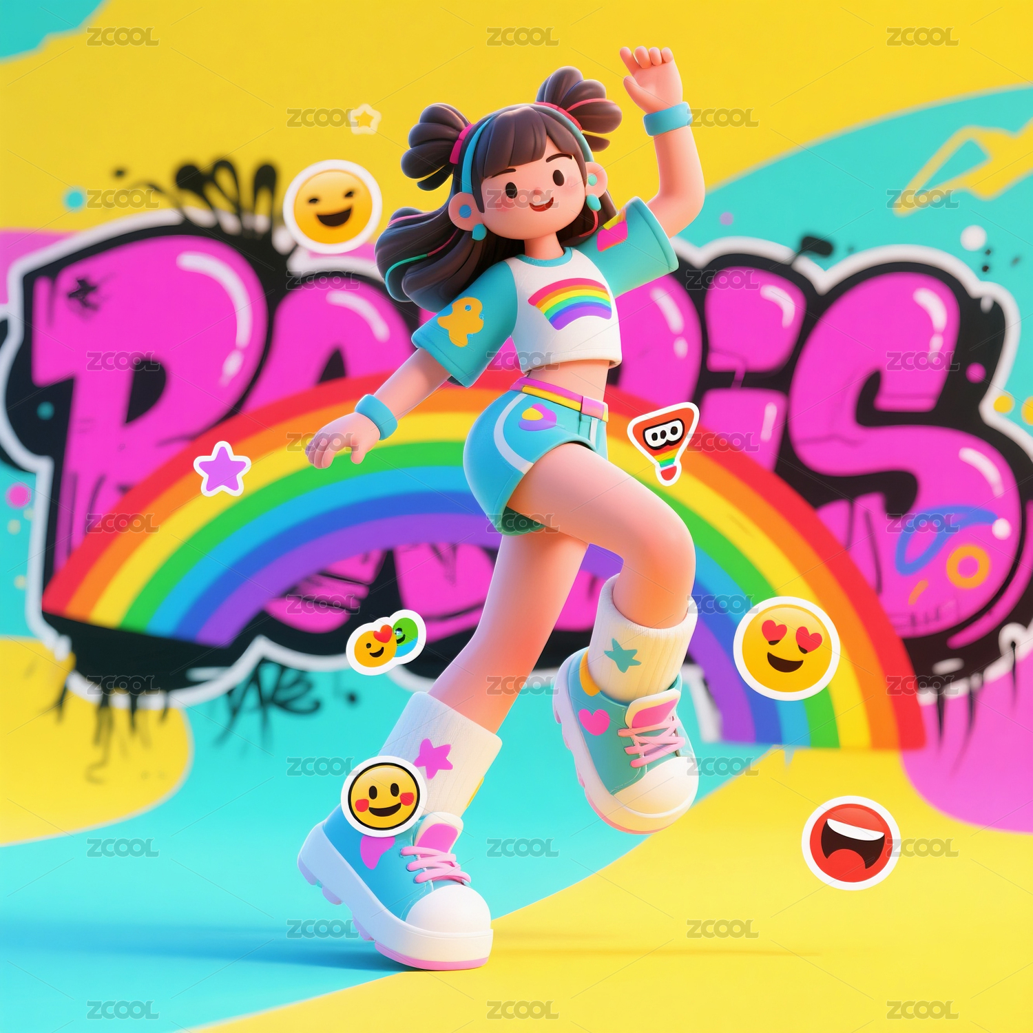 涂鸦与表情符号混合的前卫潮服美少女