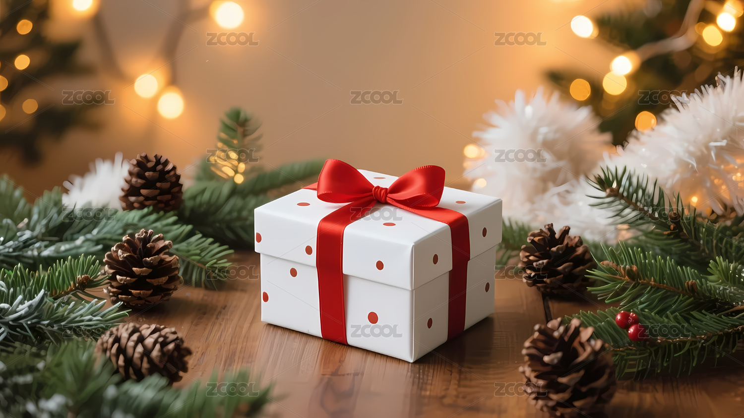 礼盒,松果,松枝,圣诞树,灯光,红色,蝴蝶结,毛绒,绿色,节日