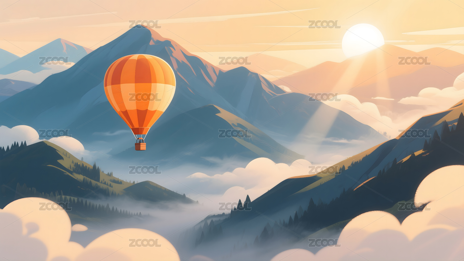 热气球,山峰,云海,天空,旅行,探险,童话,卡通,飞翔,自由