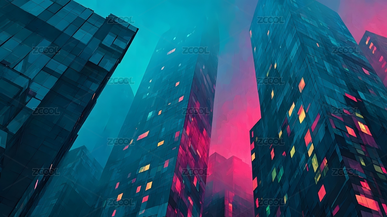 梦幻荧光色城市建筑赛博3D卡通立体插画