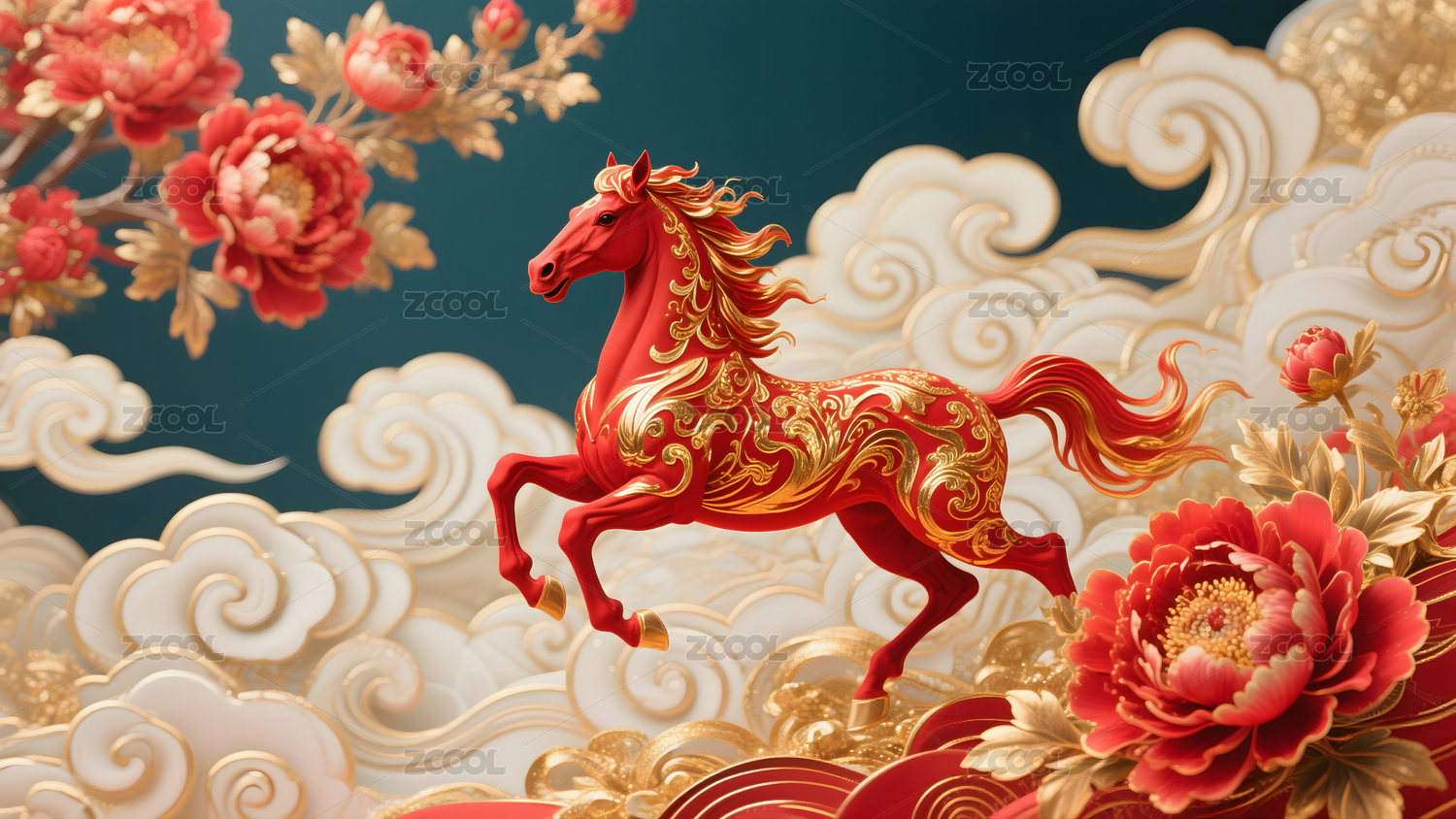 骏马,吉祥,祥云,中国风,喜庆,奔腾,活力,红色,马