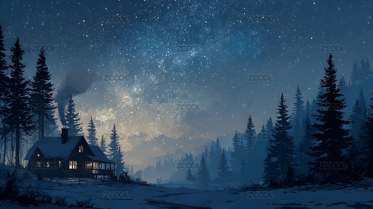 树木,自然,风景,森林,房屋,寒冷,夜空,雪,木屋,星空
