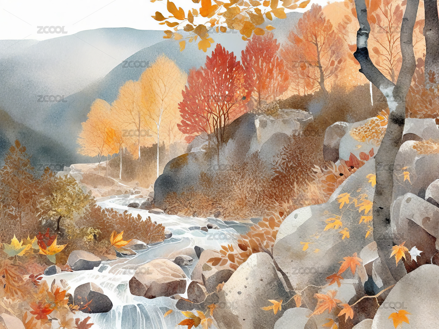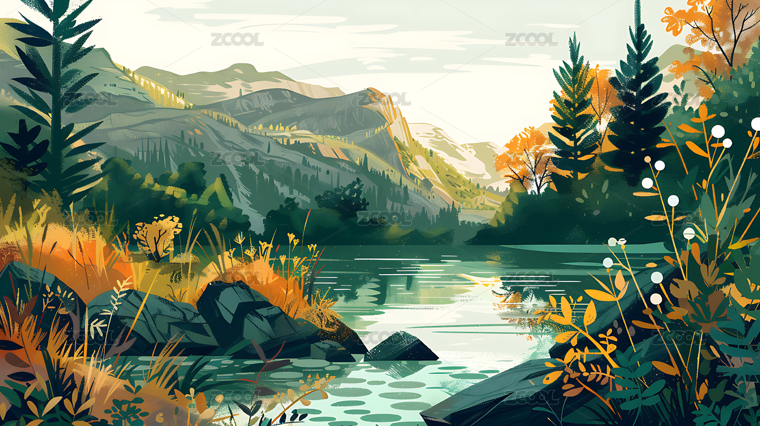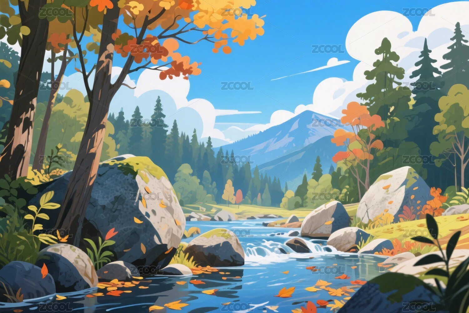 山脉,瀑布,水池,树木,植被,蓝天,石头,水面,倒影,荷叶