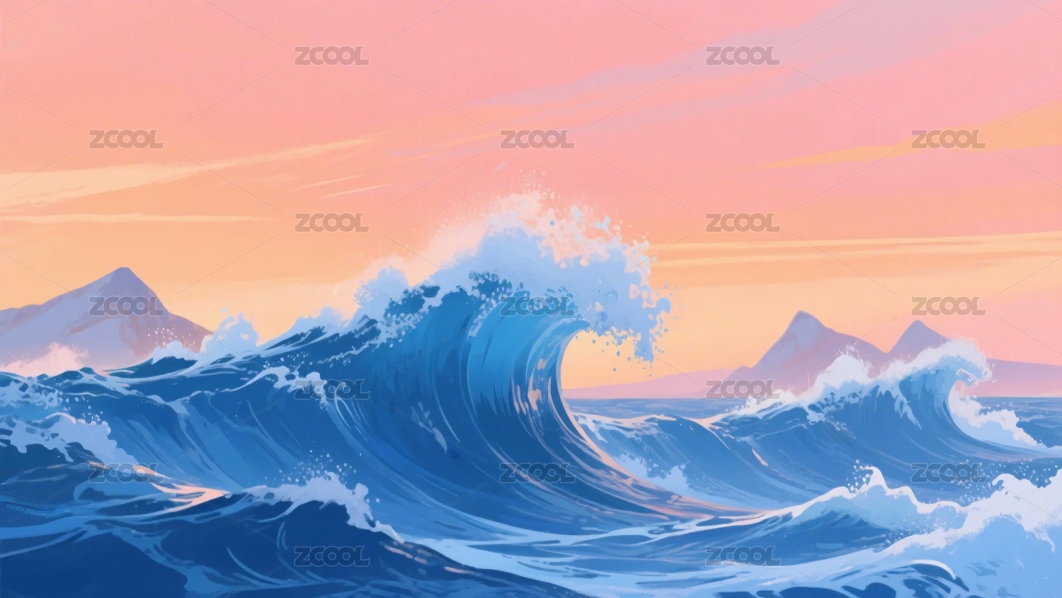 海浪,落日,海洋,天空,插画,矢量,风景,自然,色彩,绚丽