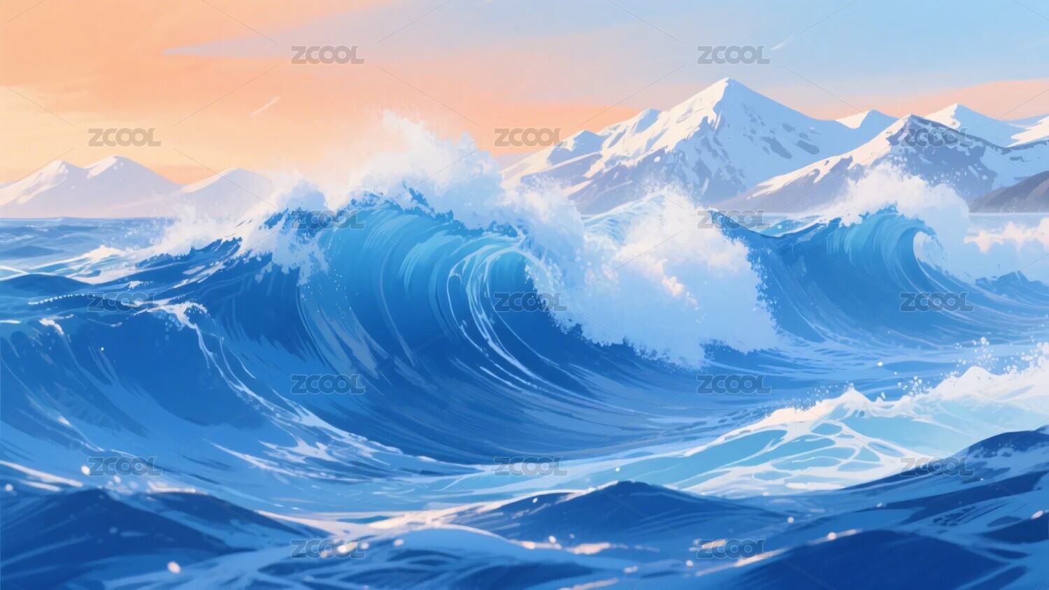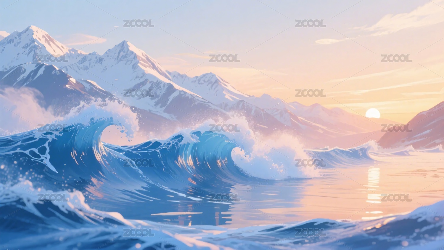 海浪,雪山,日出,天空,水面,自然风景,插画,矢量,美景,景观