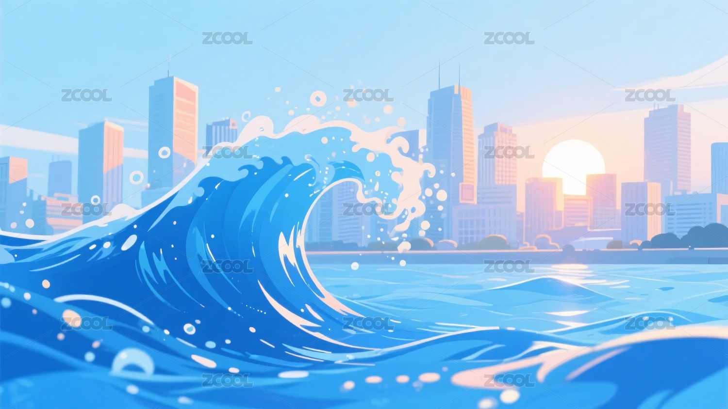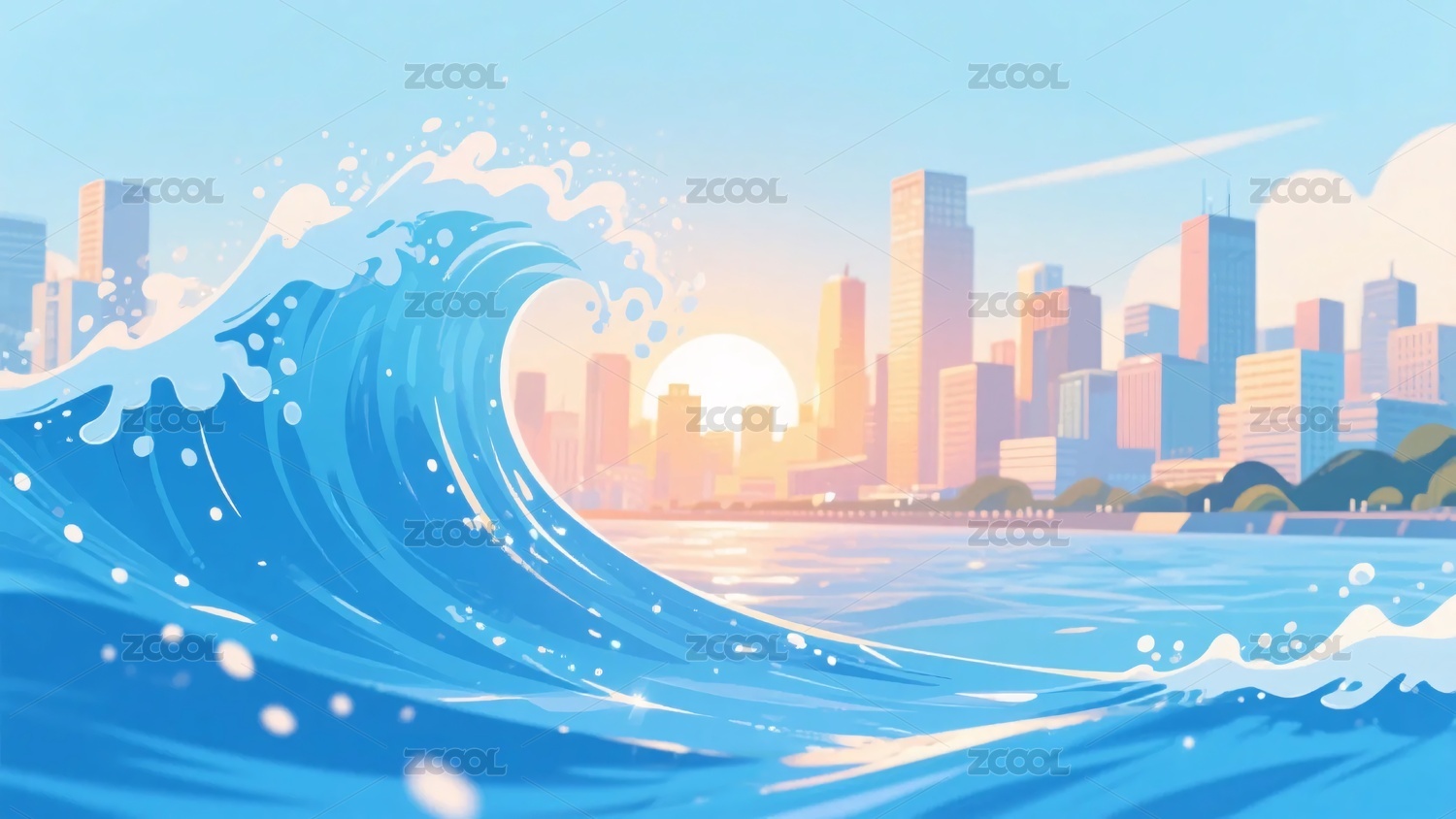 城市,日落,插画,矢量,背景,风景,天际线,建筑,波浪,光影