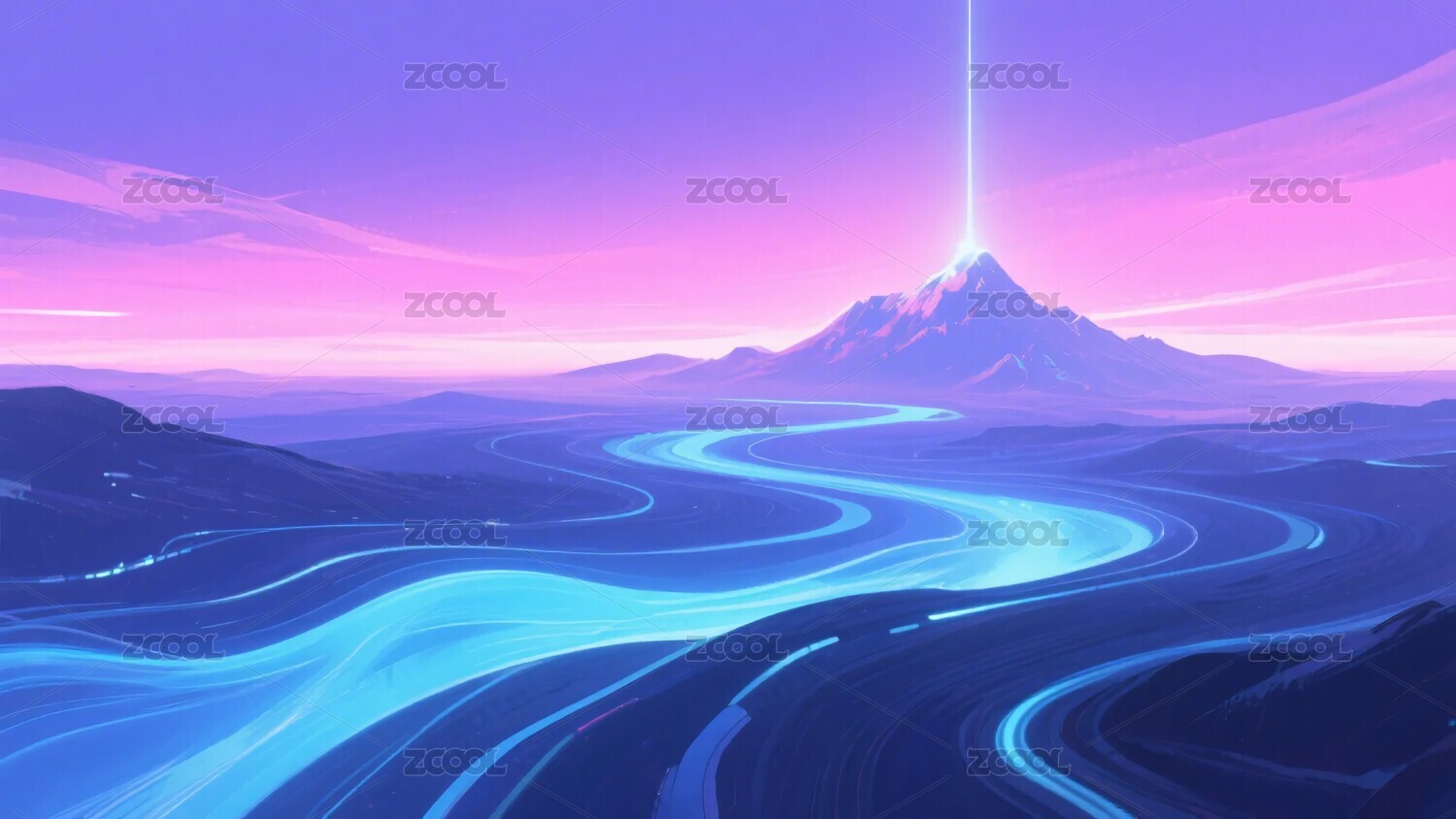 山脉,河流,霓虹光,插画,科幻,梦幻,夜景,紫色,蓝色,光效