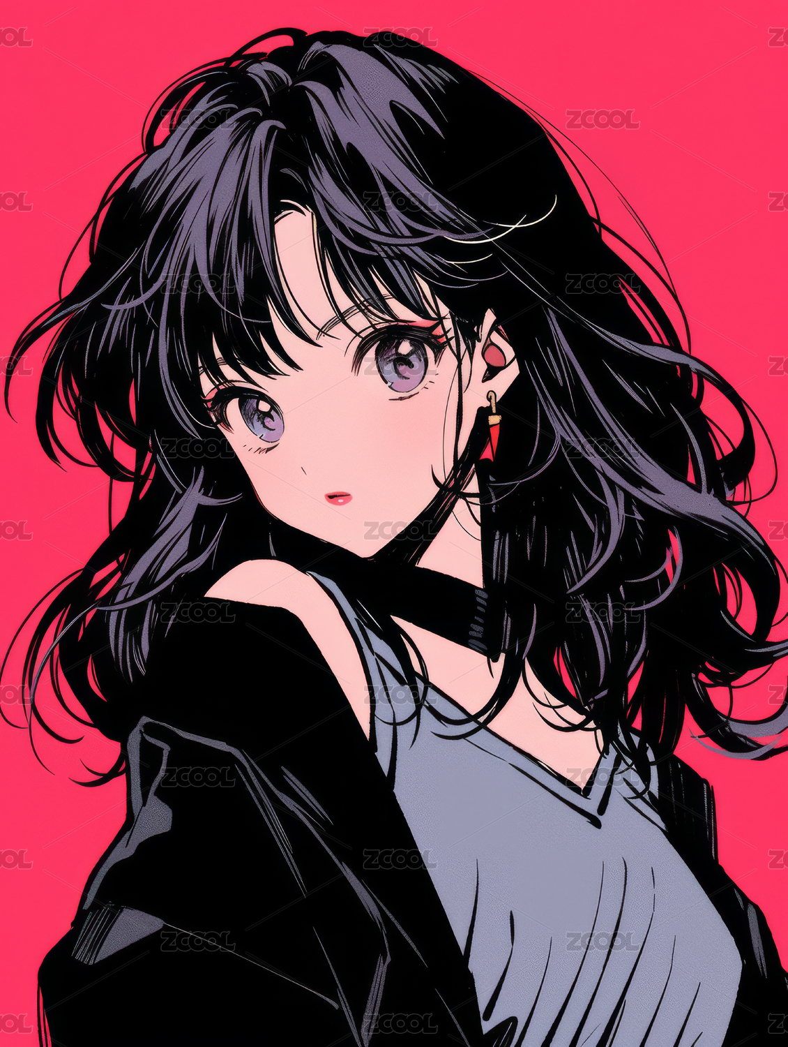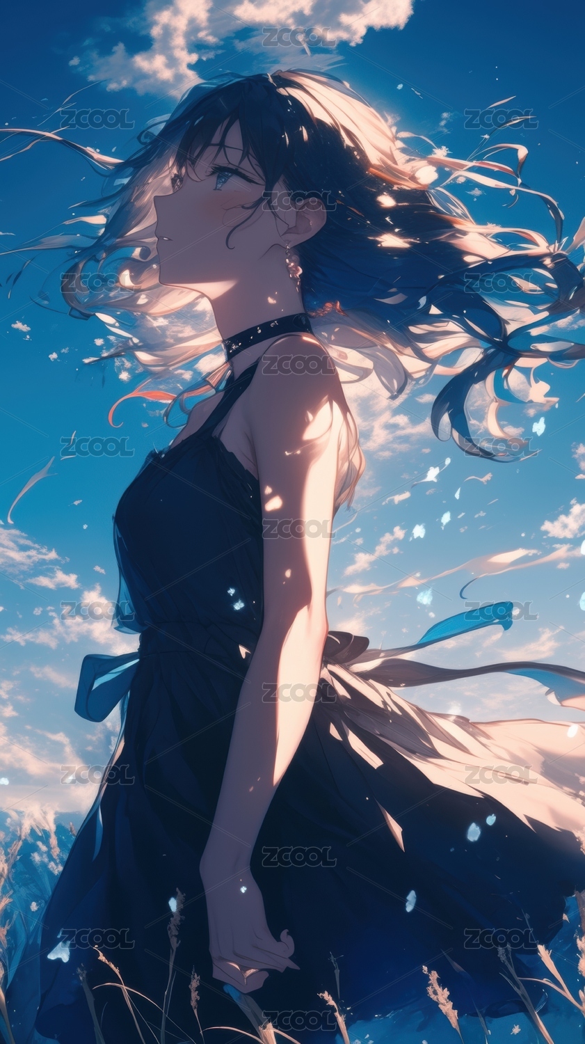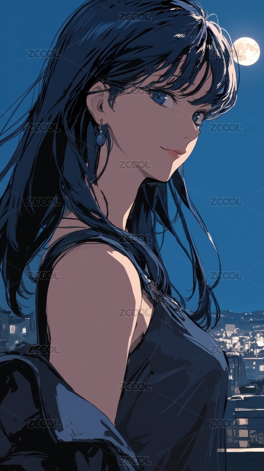 动漫,黑发,女子,侧影,黑色,上衣,深色,长裙,动漫风,神秘