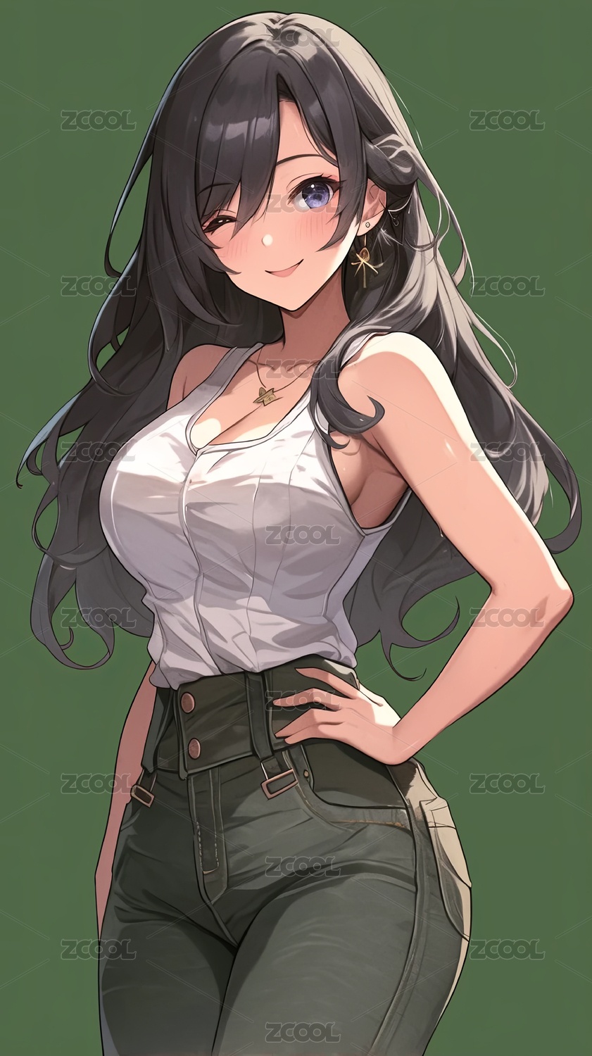 动漫,女性,休闲,白色,背心,牛仔裤,插画,角色,时尚,年轻