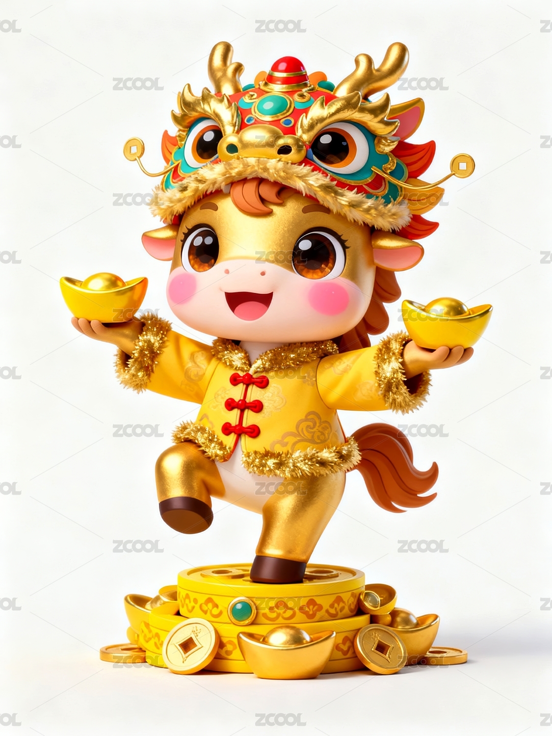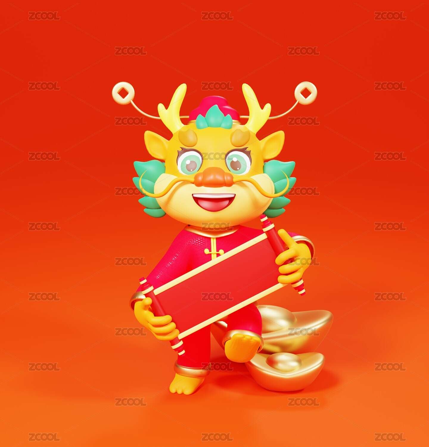 卡通财神龙手拿对联,周围是元宝3D建模插