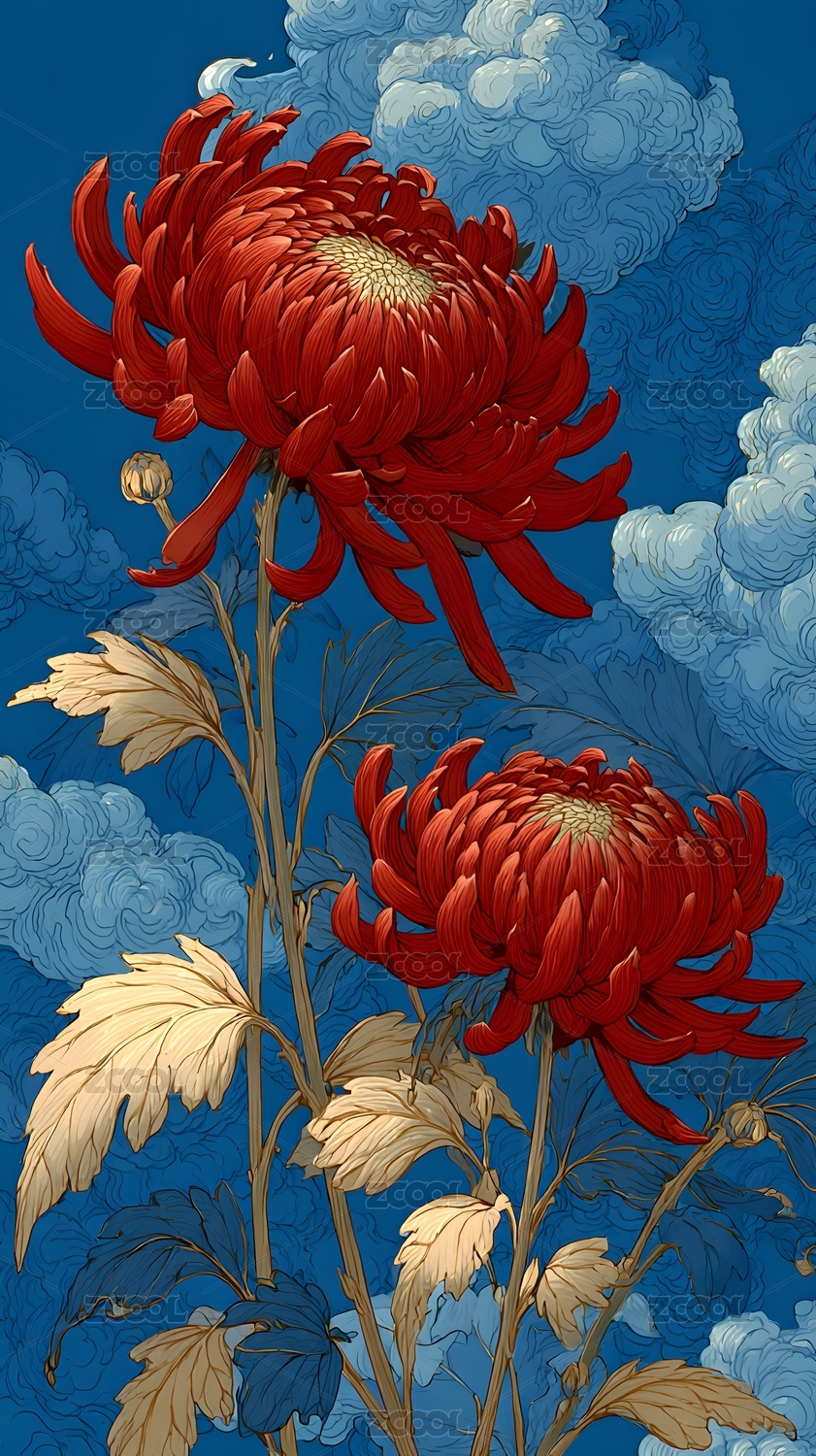 红底金云下绽放的绚烂菊花