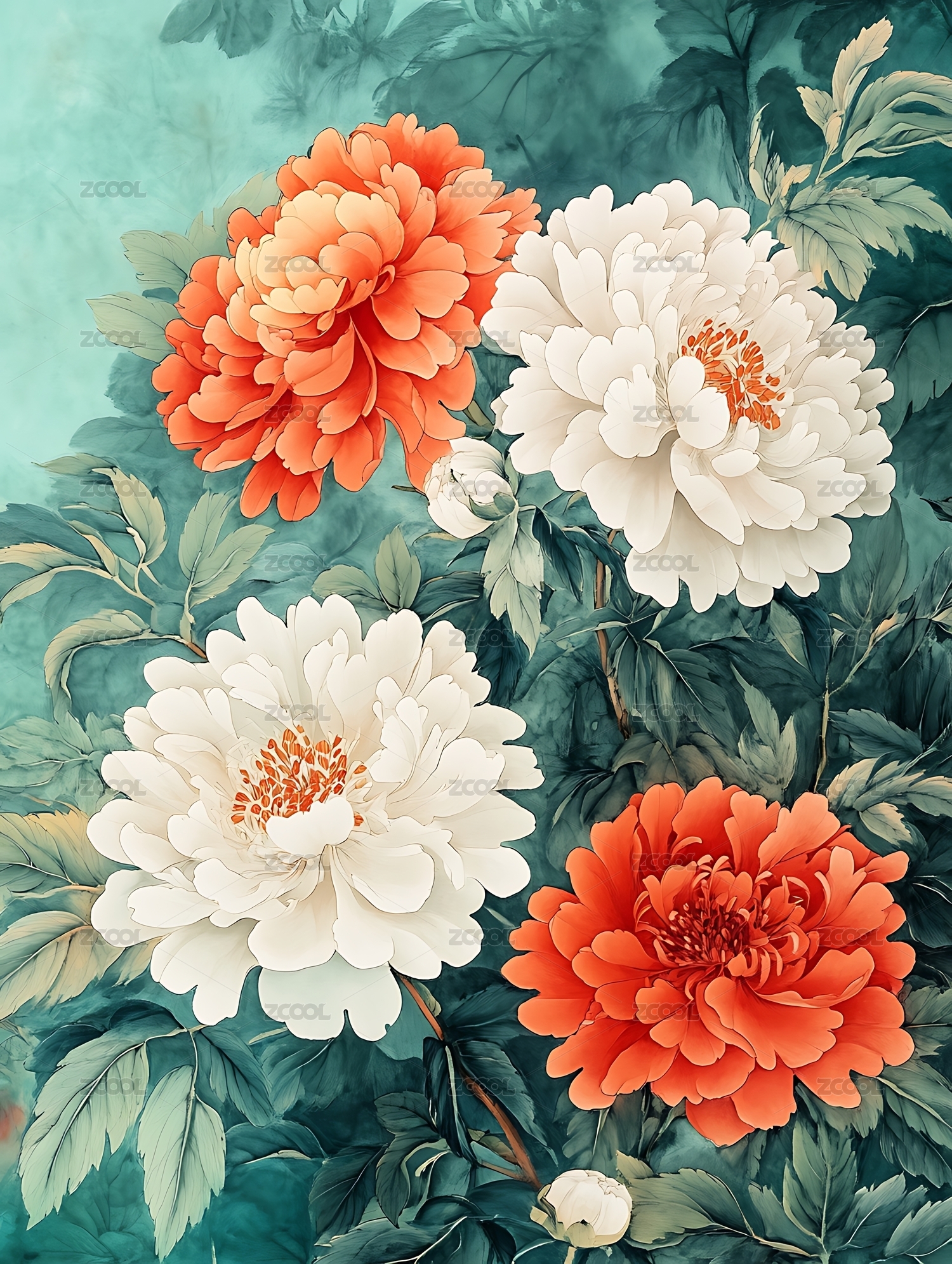 山水牡丹花卉艺术插画
