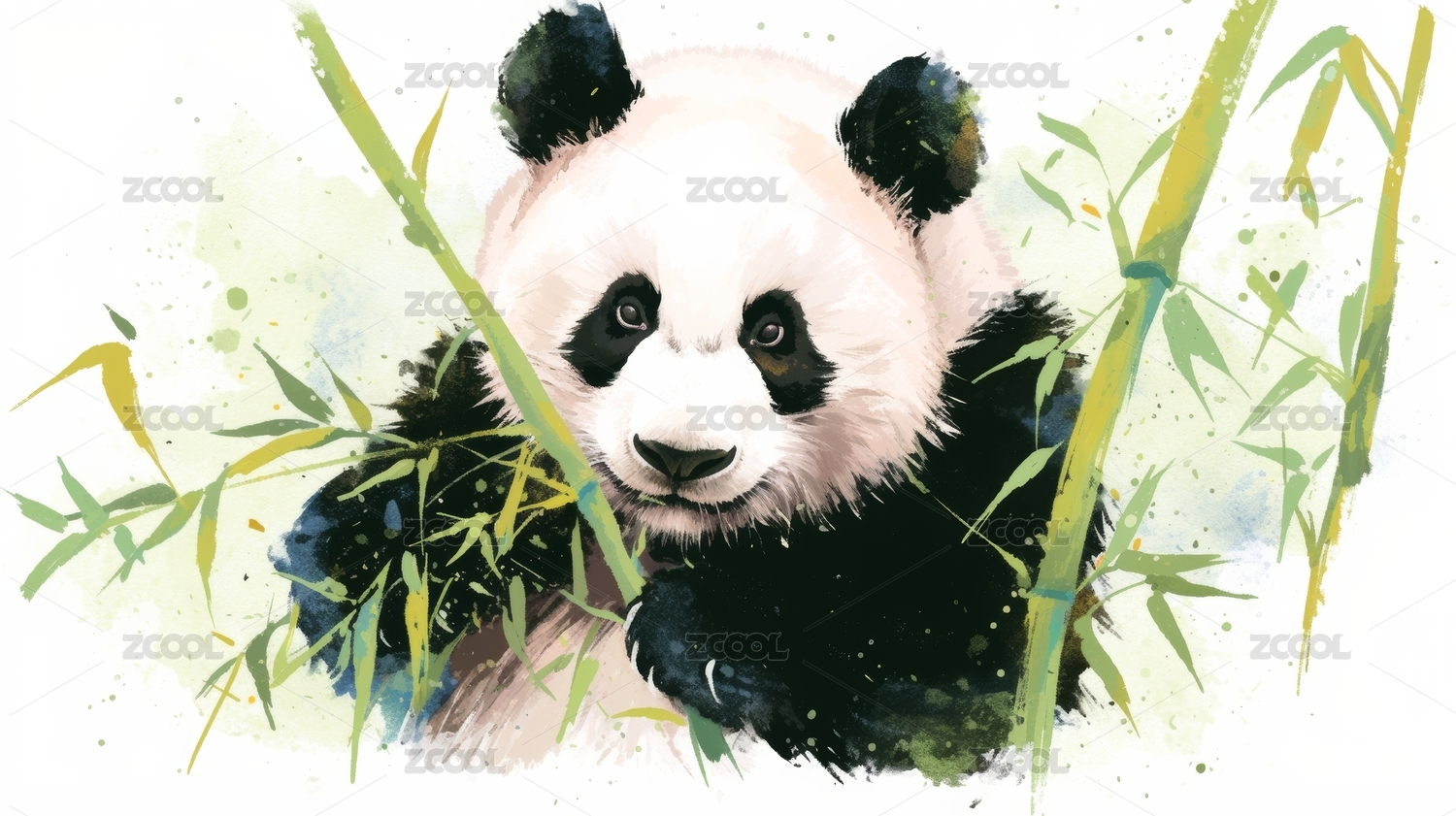 竹林里一只可爱大熊猫水彩插画