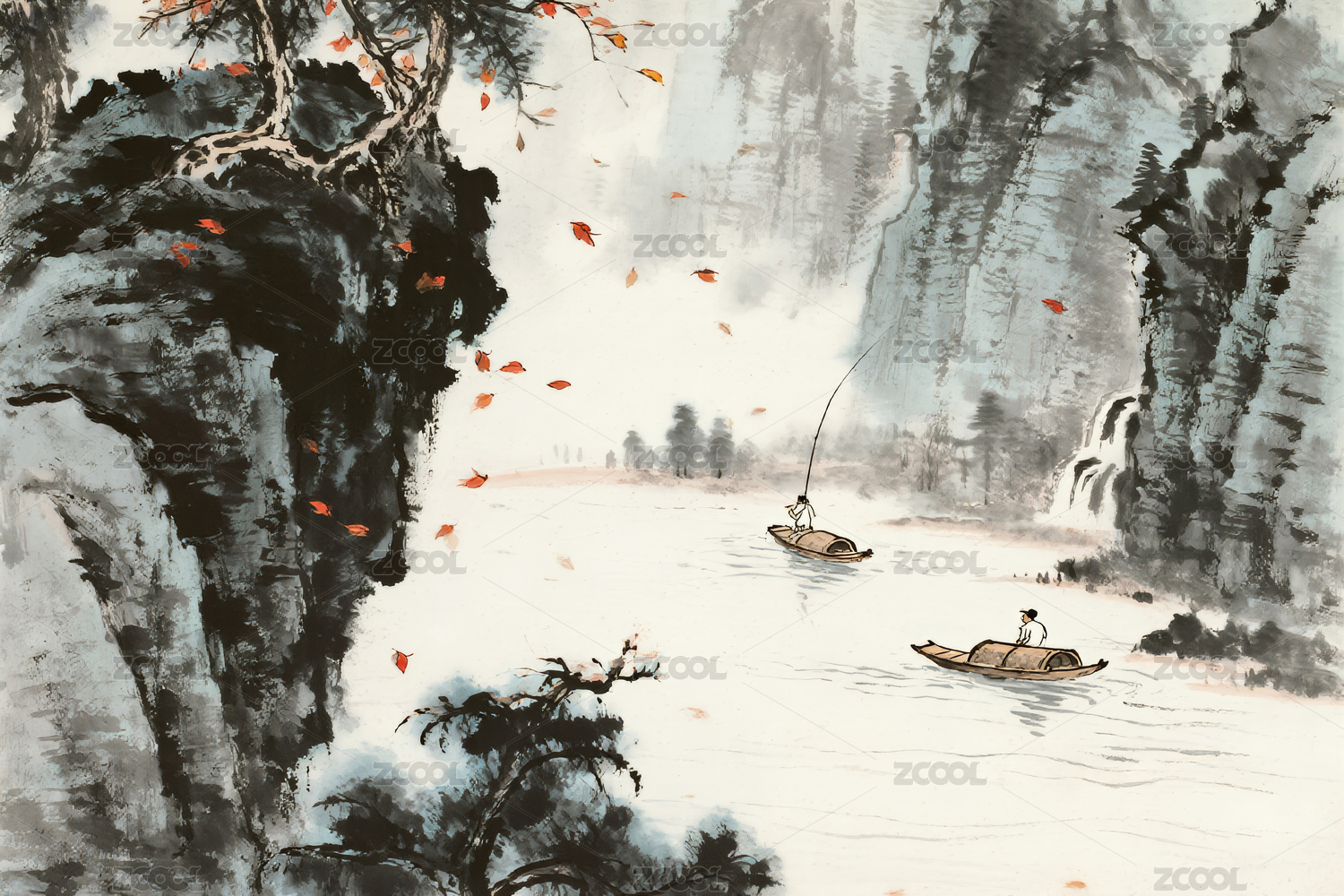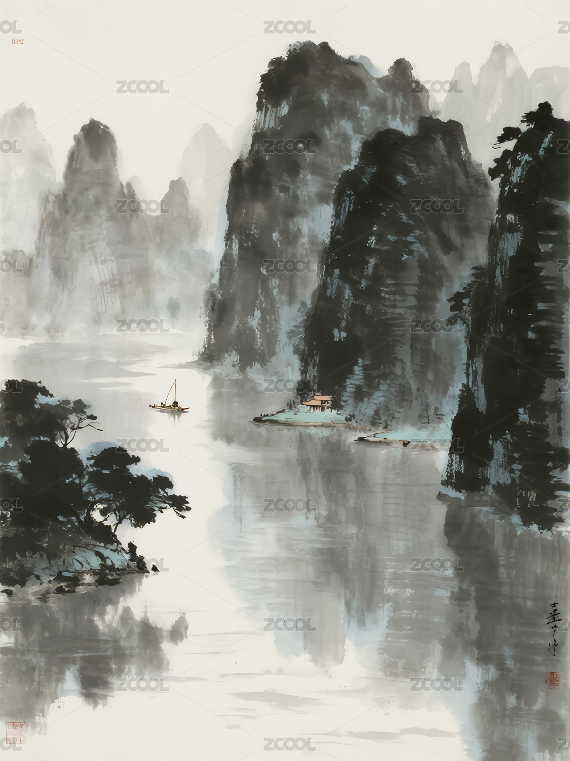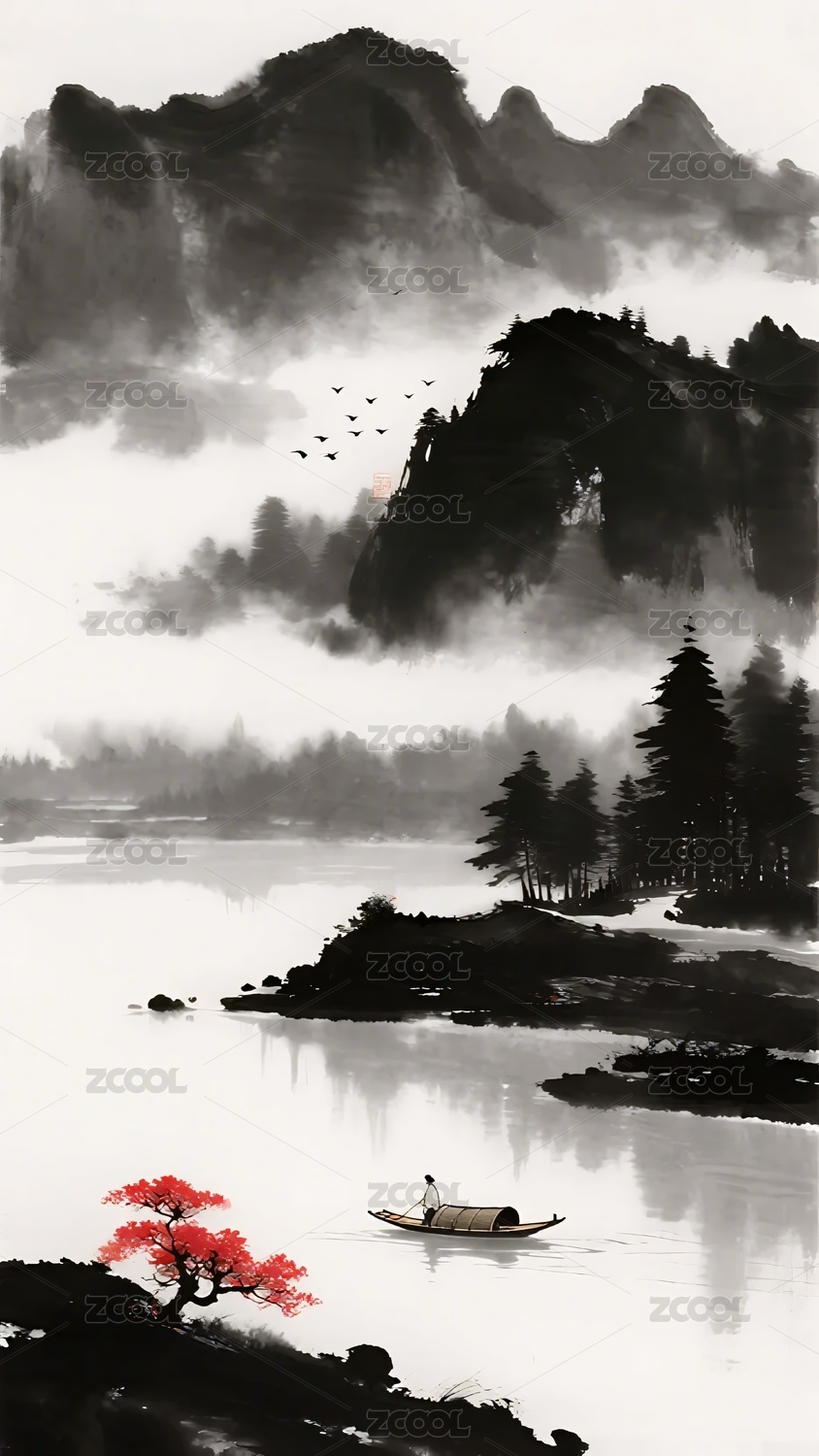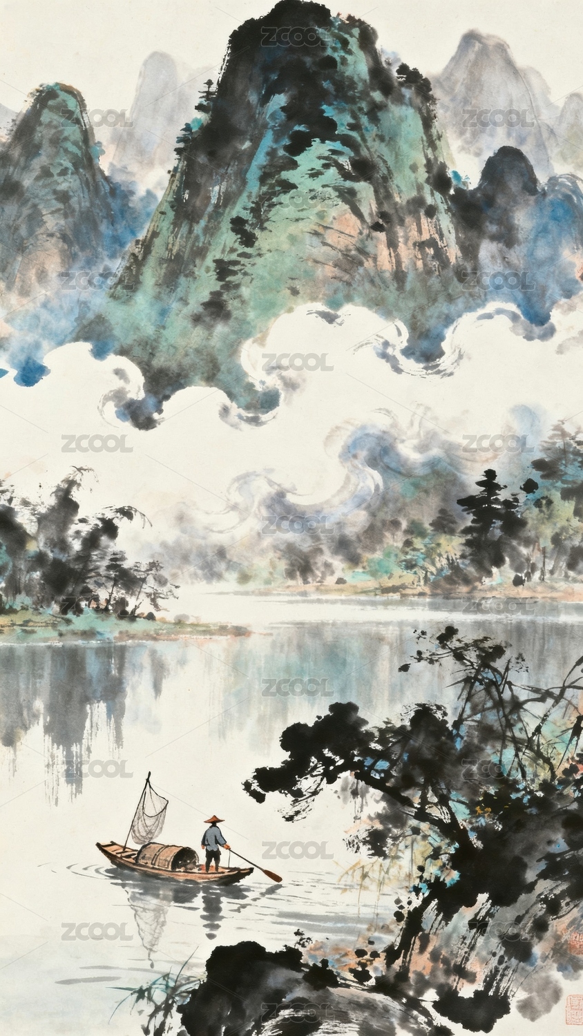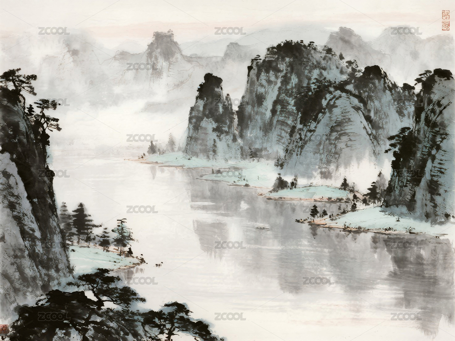树木, 自然, 风景, 河流, 云雾, 山峰, 传统, 艺术, 绘画, 东方