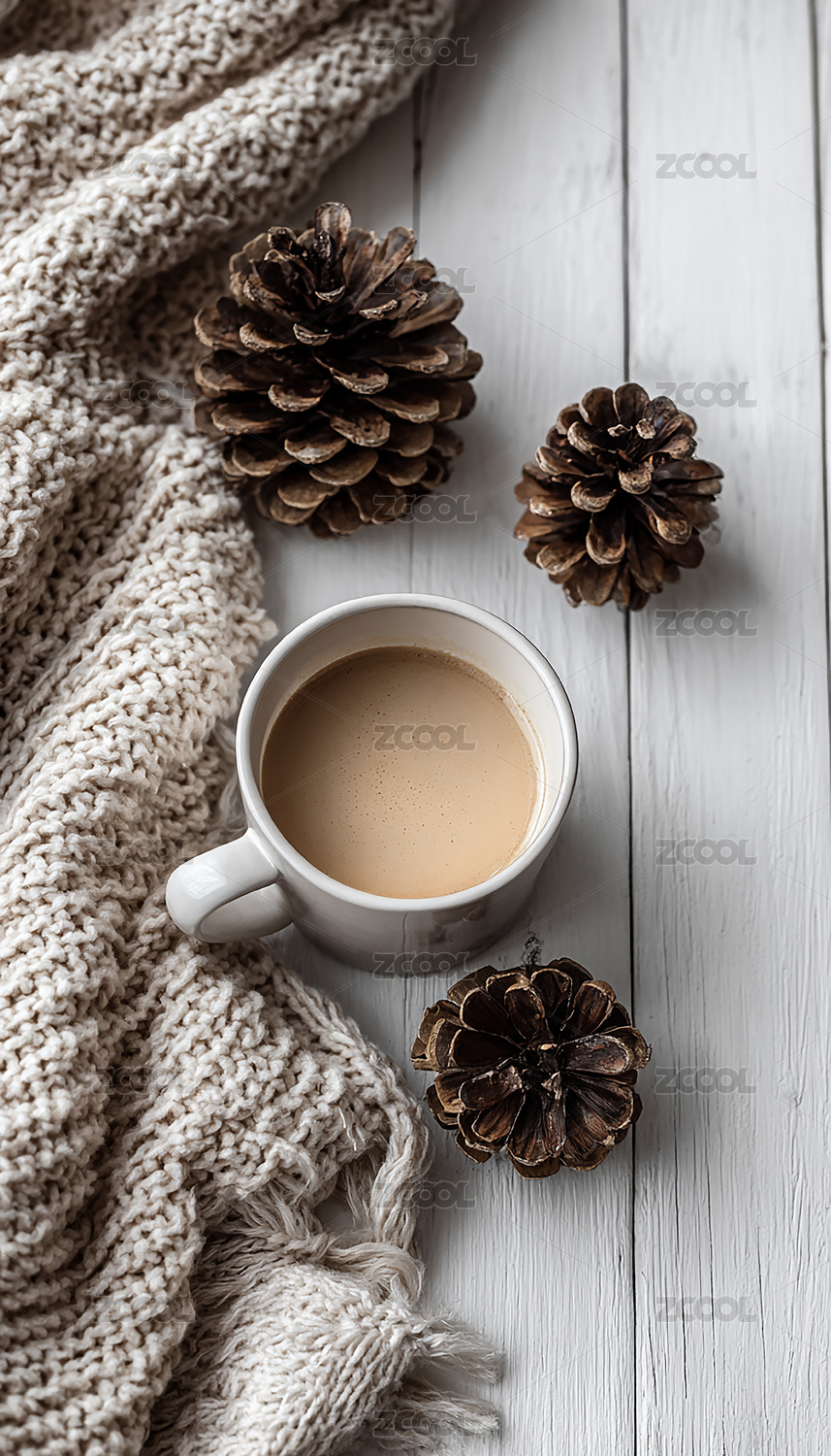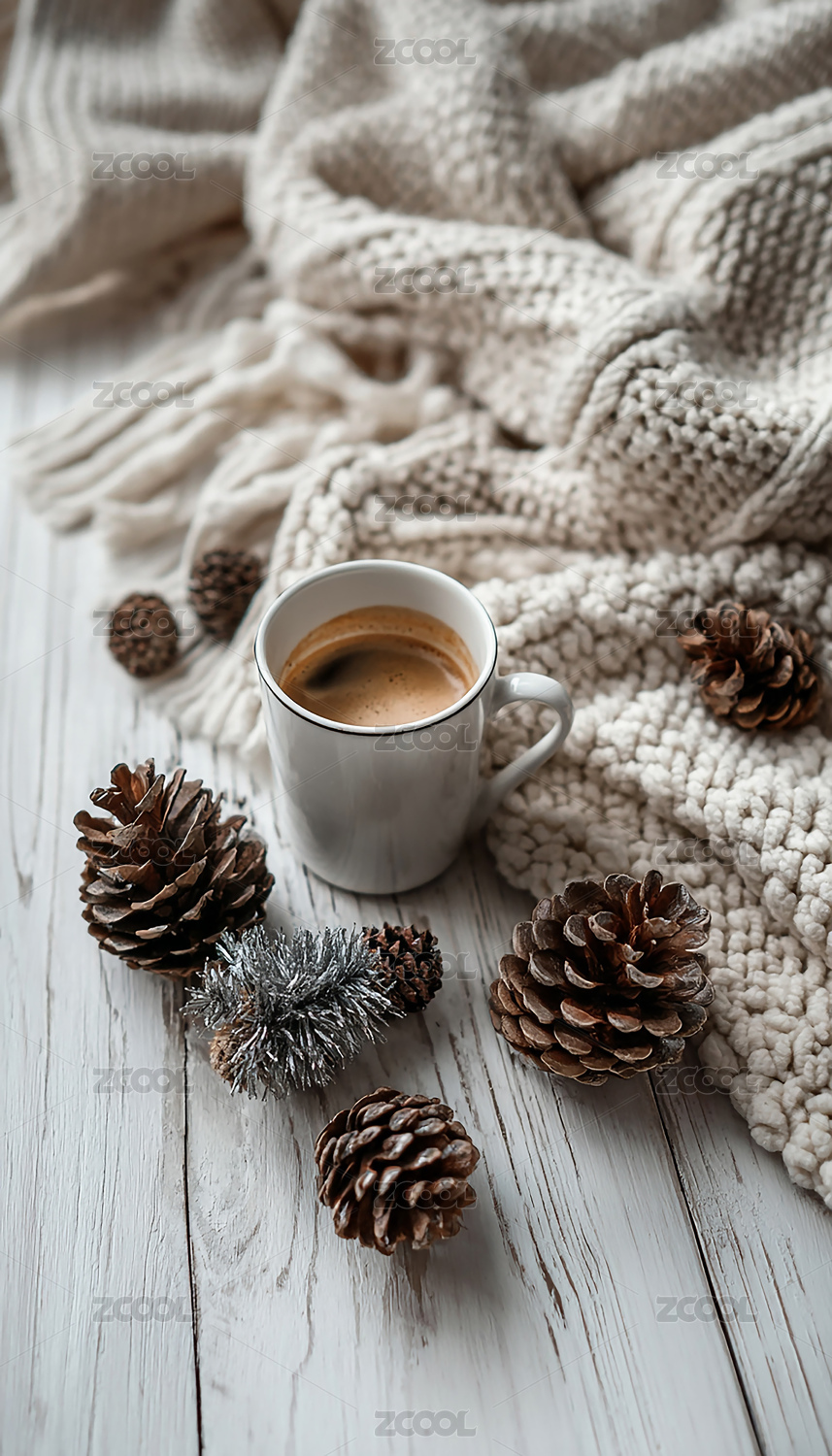 咖啡杯,毛毯,松果,冬季,氛围,暖色调,白色,桌面,针织,静物