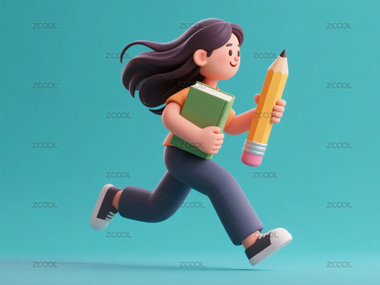 女孩奔跑手持铅笔书籍