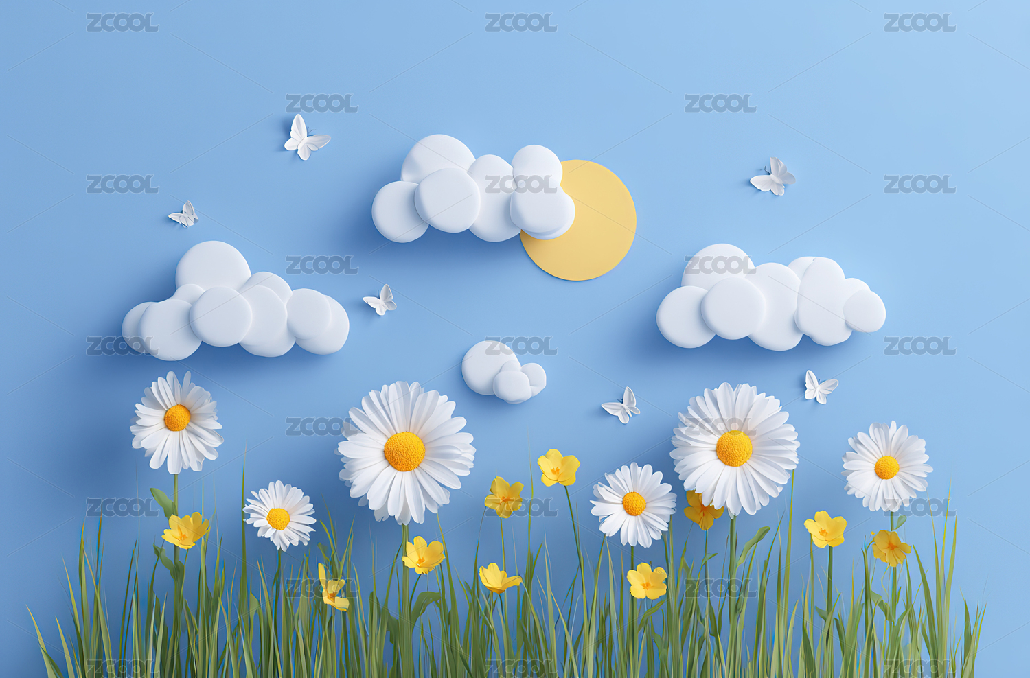 纸艺风格的蓝天白云与雏菊