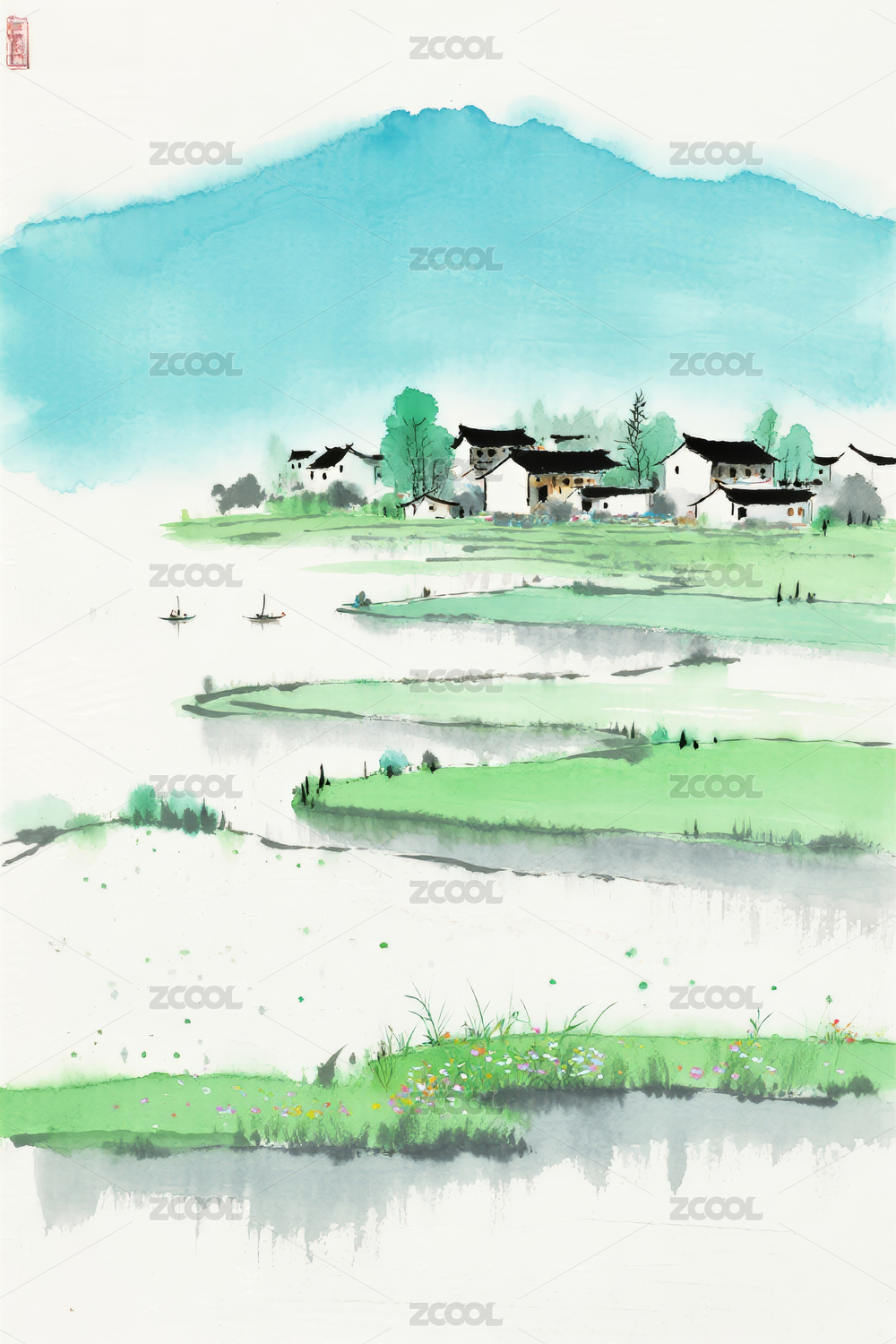 水墨乡村山水画