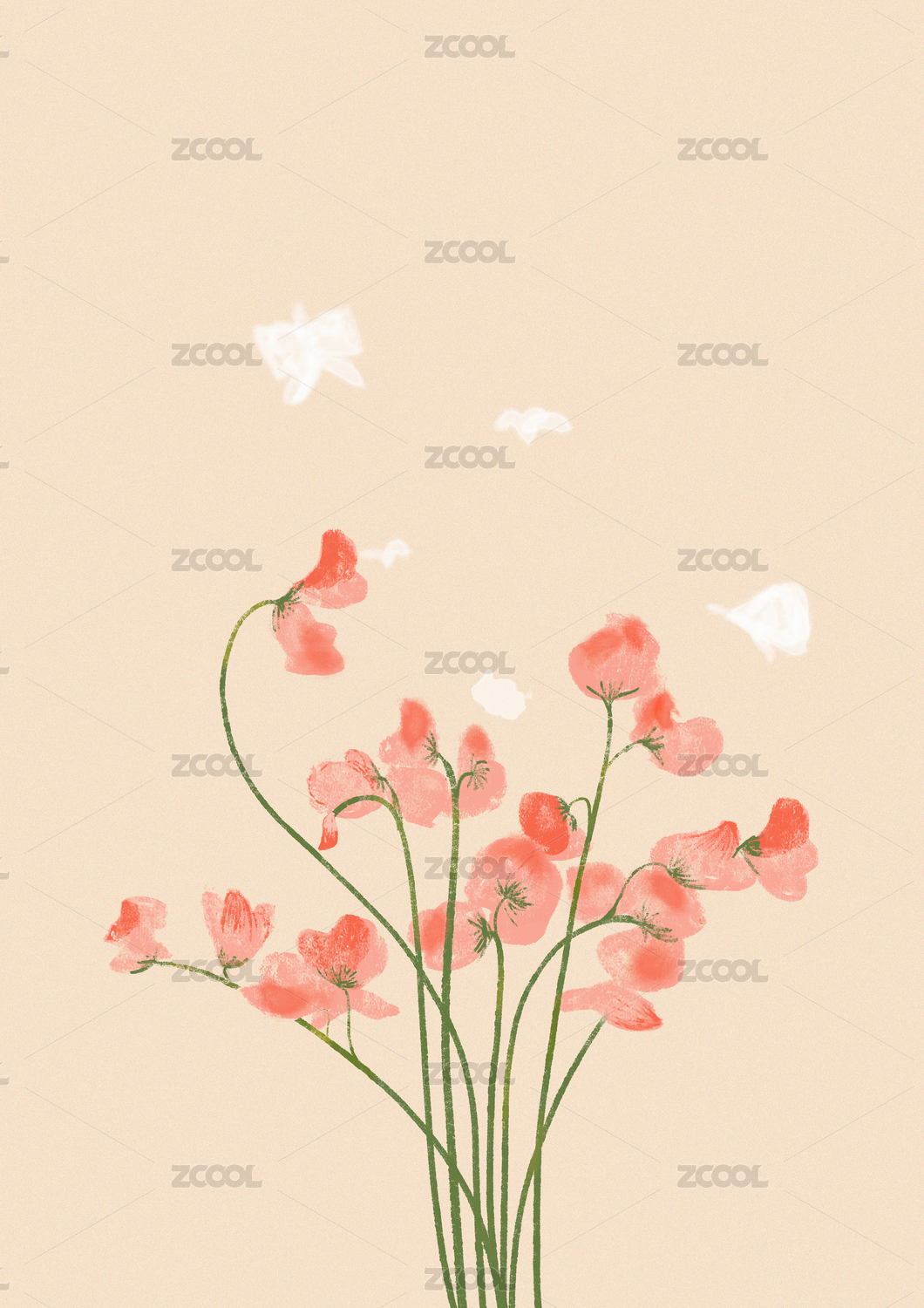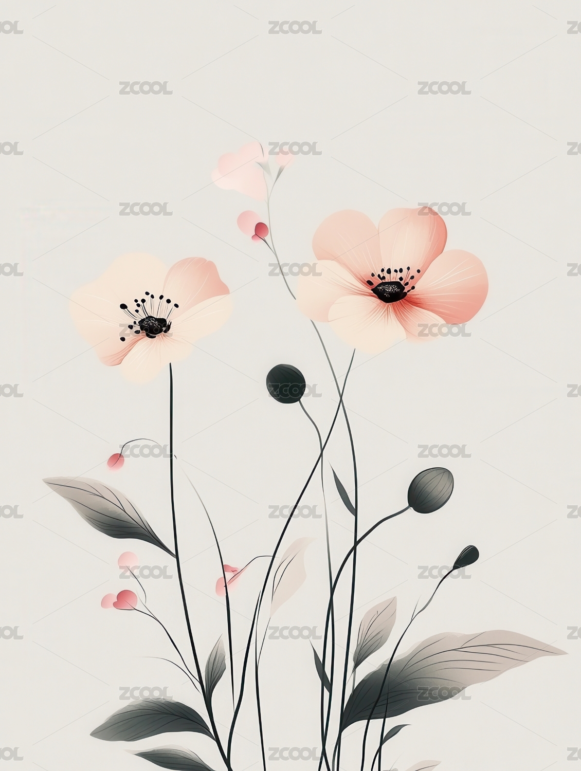 白色花朵,绿叶,插画,花卉,植物,简约,淡雅,自然,清新,唯美