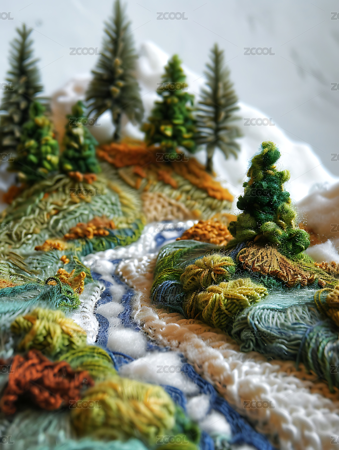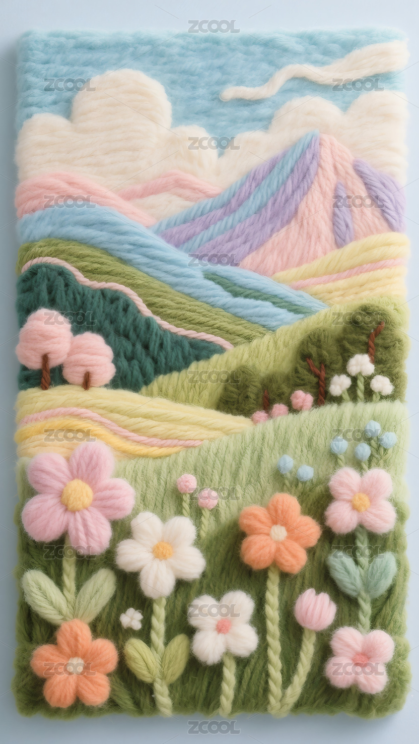 清新淡雅毛线毛绒编织自然山丘风光浮雕插画