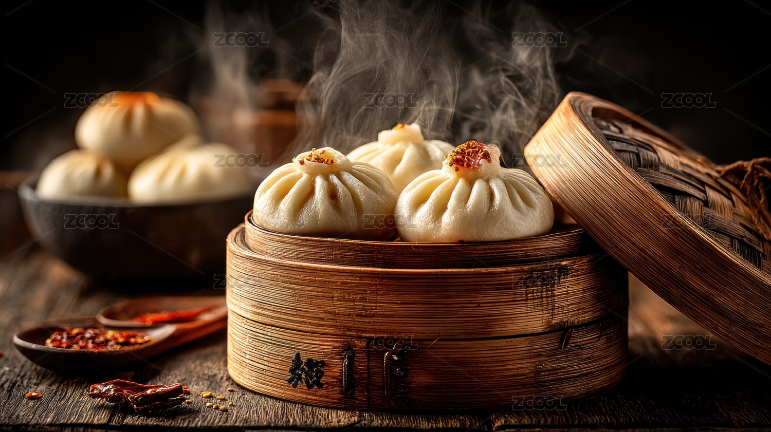 蒸笼里冒热气的灌汤特写背景是质朴的包子店