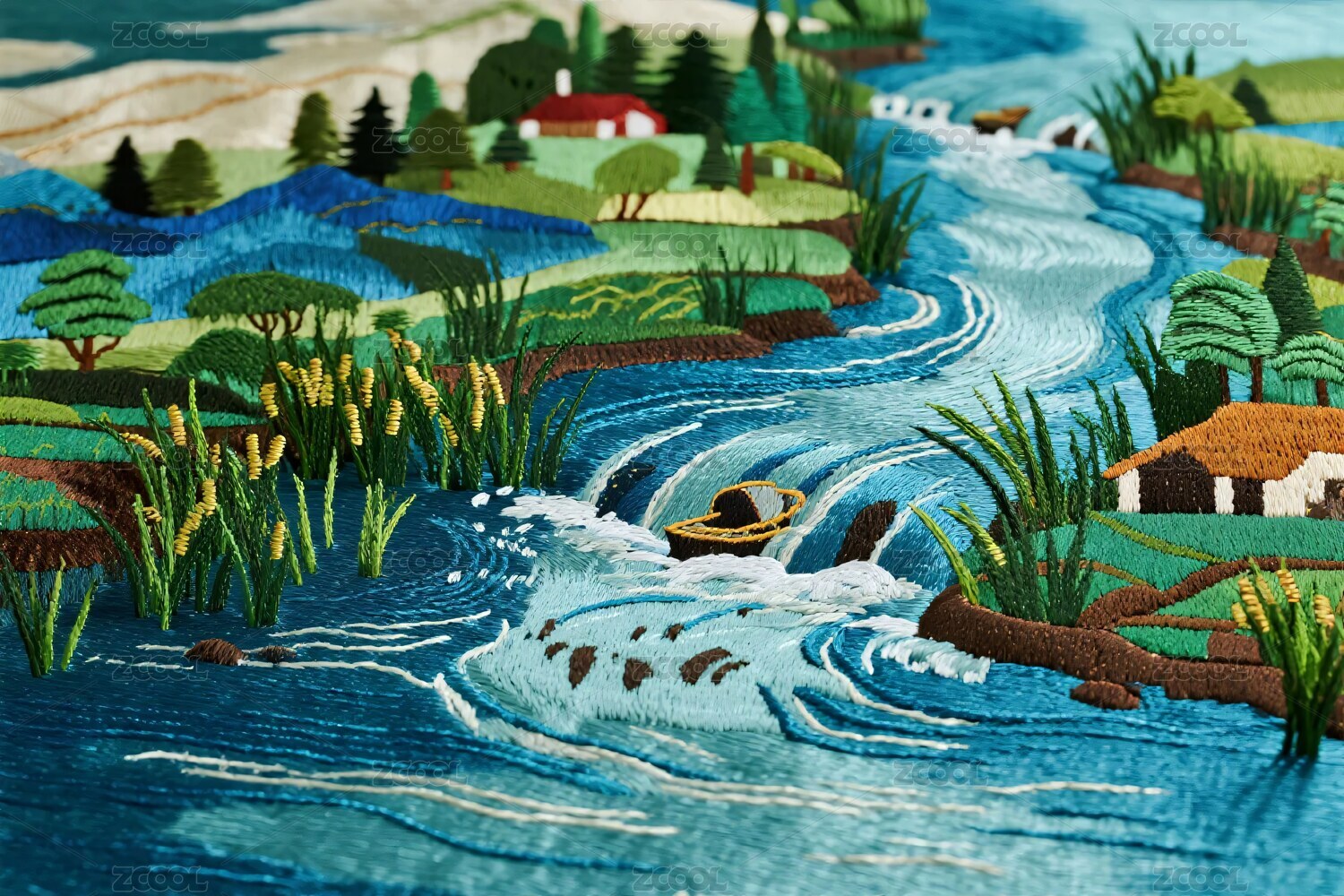 小船,河流,山水,绣品,手工艺品,绘画,刺绣,自然风景,水面,植被