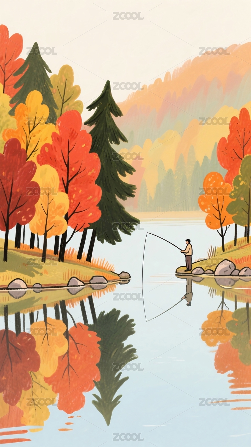山水风景,湖水,小船,树林,山峦,天空,树木,插画,风景画,手绘