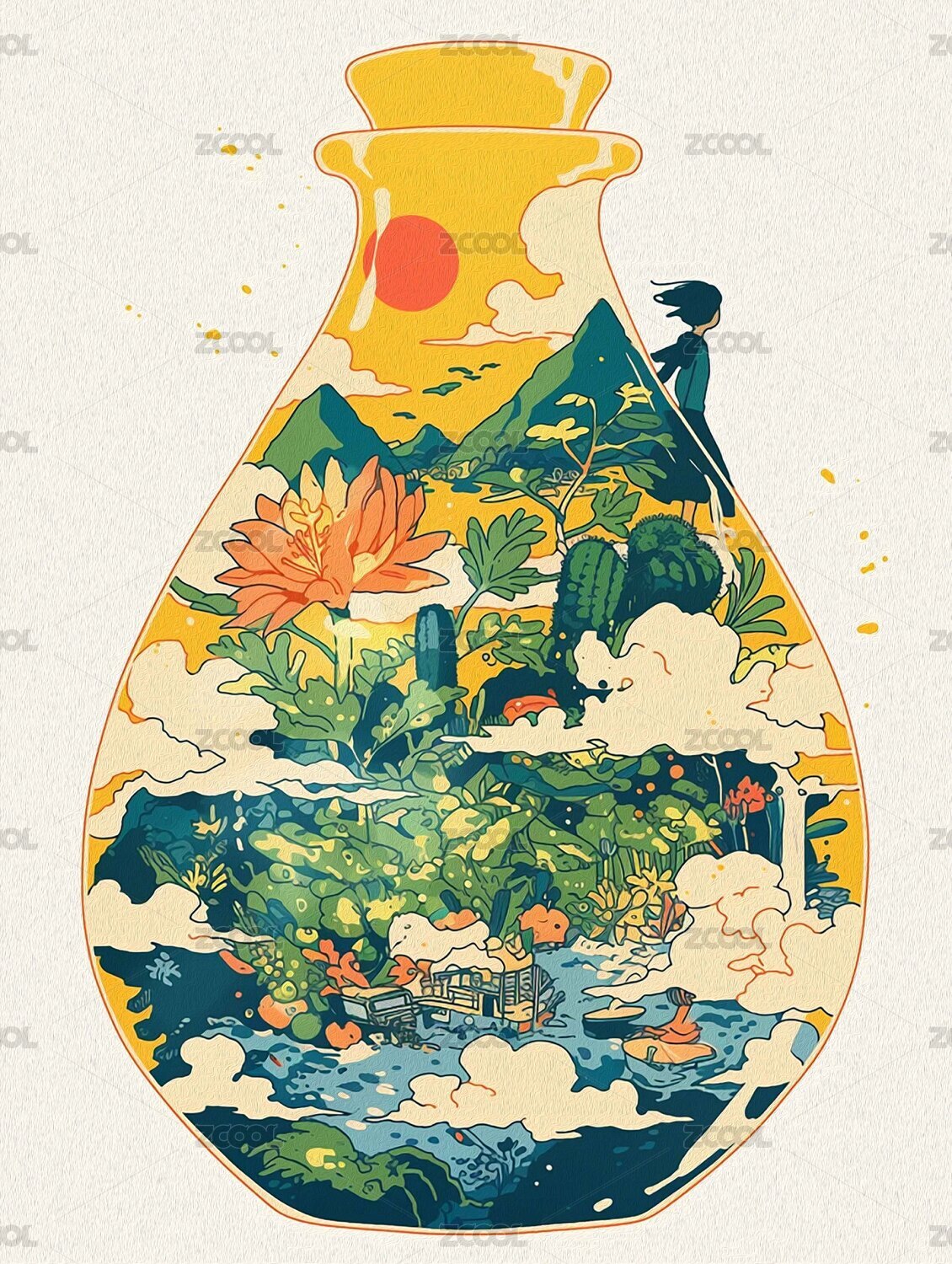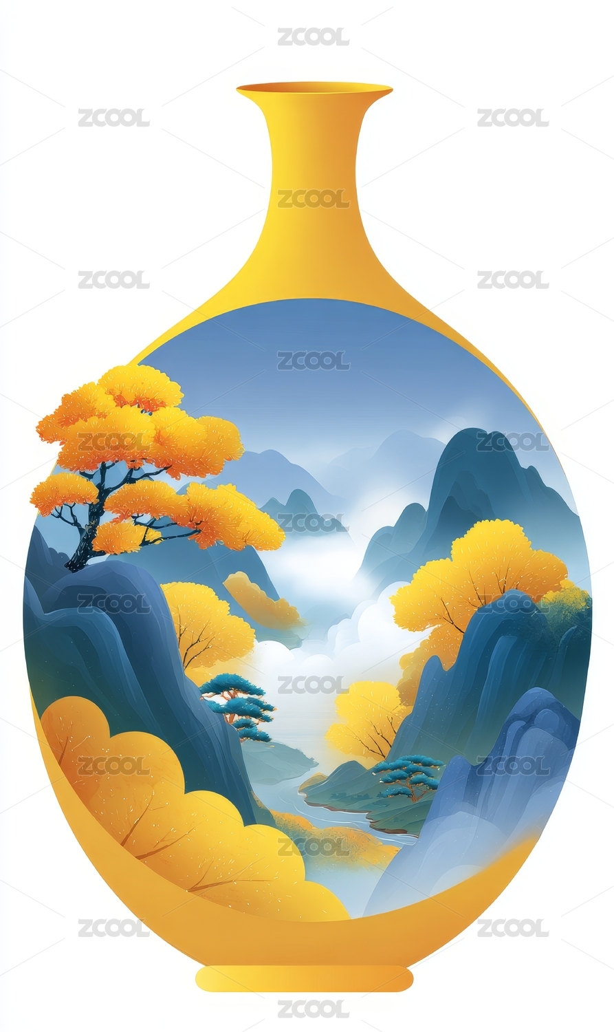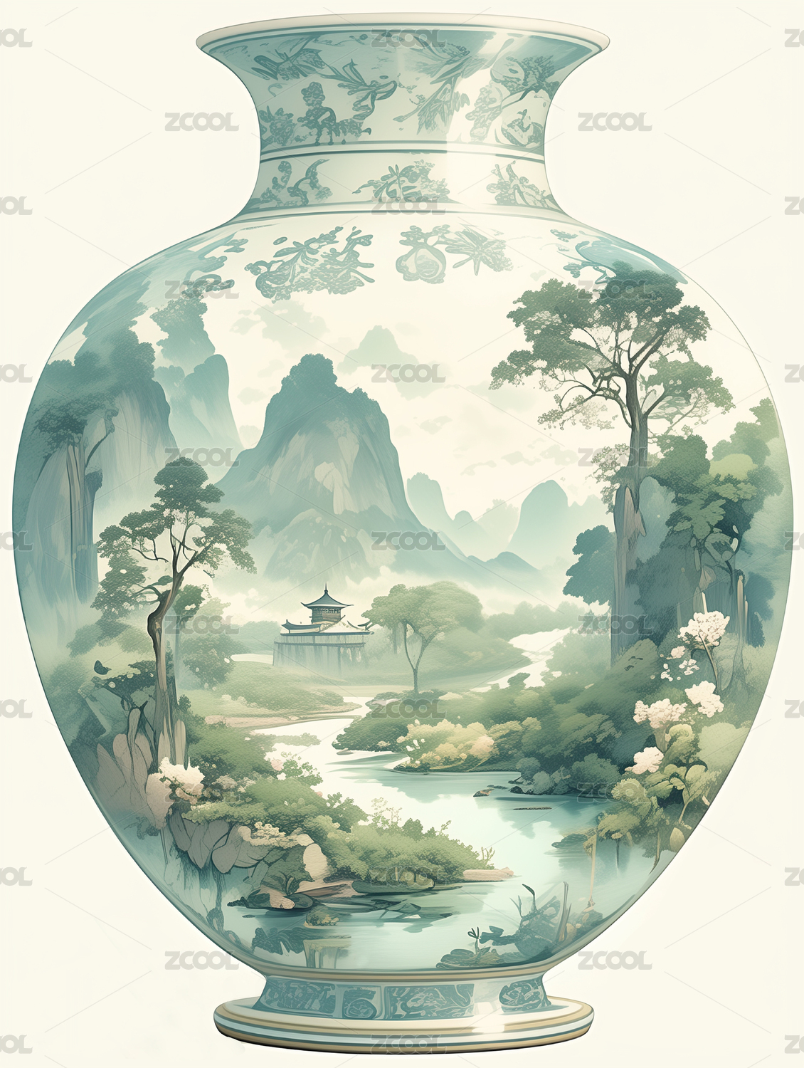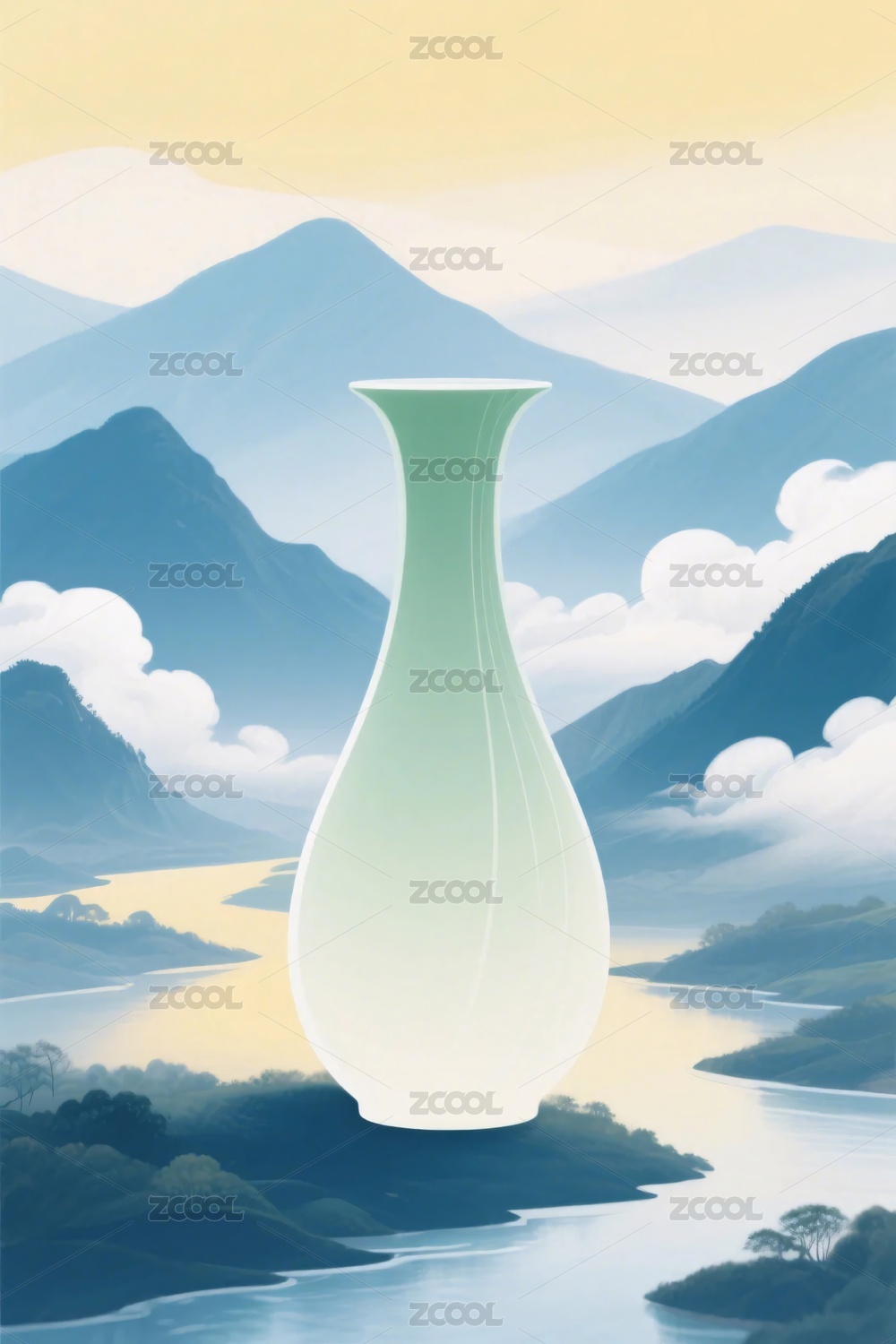 山水,花瓶,云朵,河流,插画,模板,艺术,装饰,风景,山水画