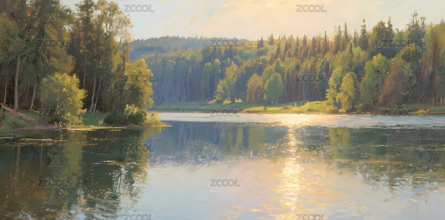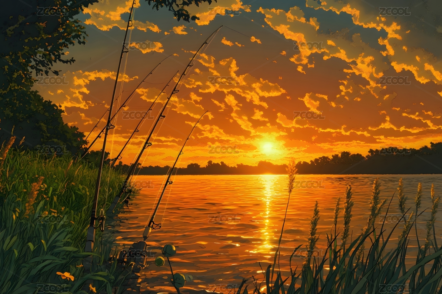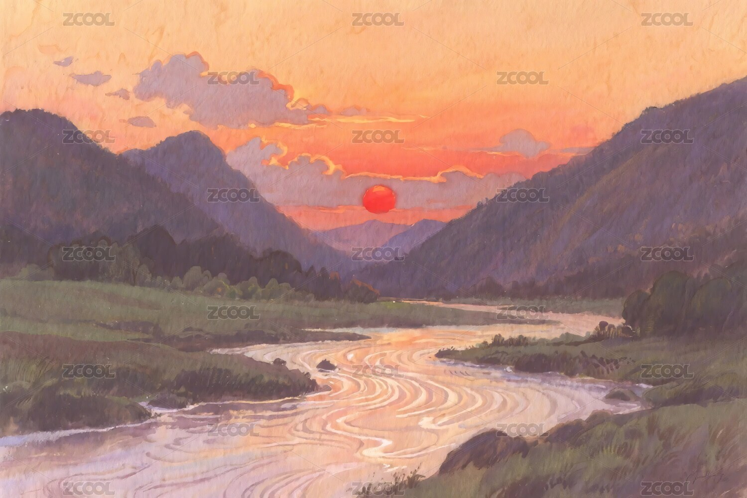 河流,飞鸟,天空,树木,草地,太阳,日落,风景,插画,绘画