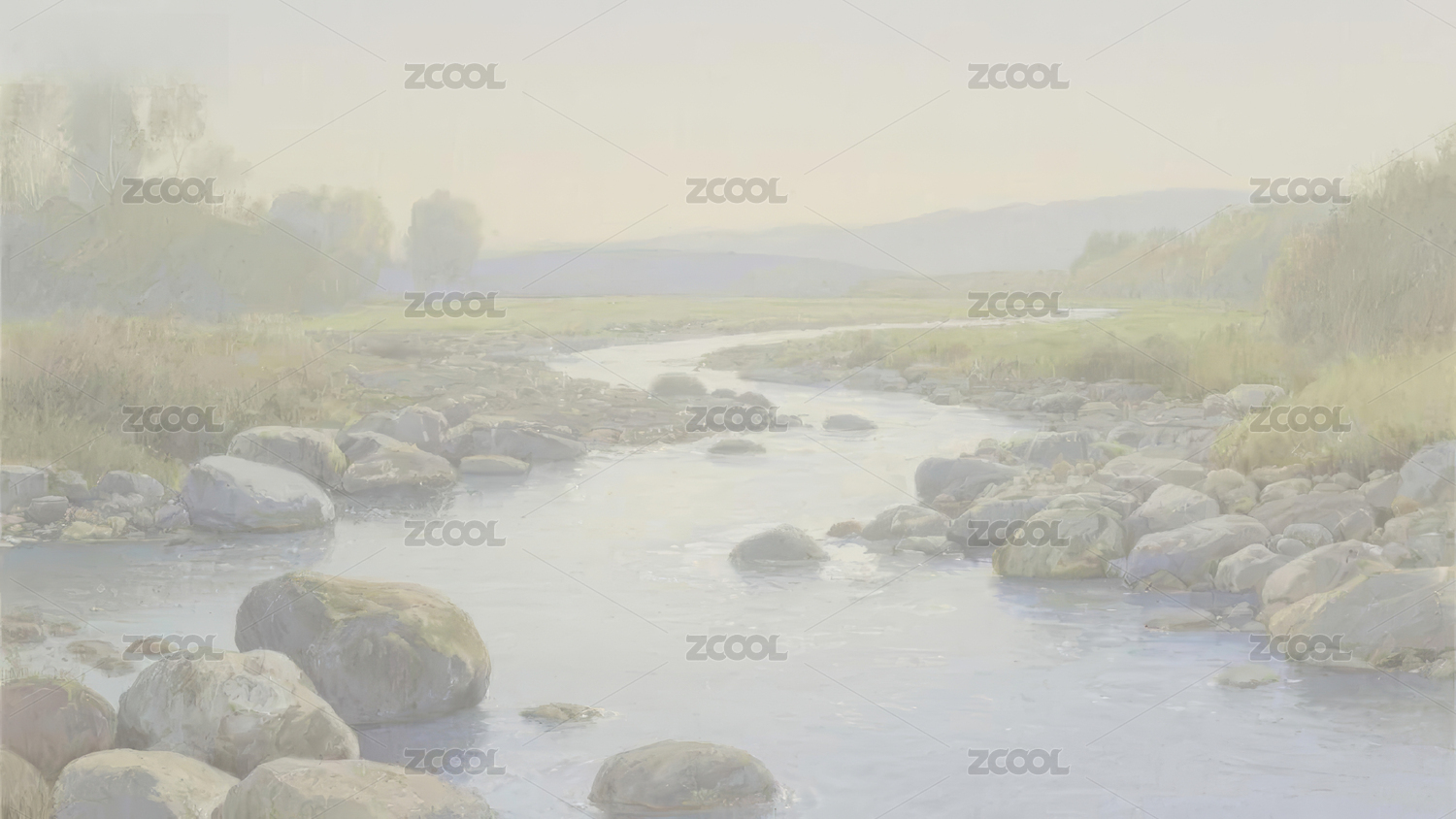 厚涂粗笔触印象派梦幻河边日落景观背景海报