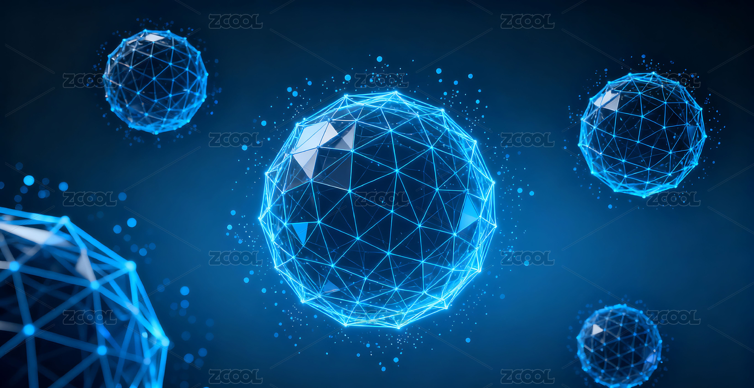 蓝色几何球体悬浮于暗色背景