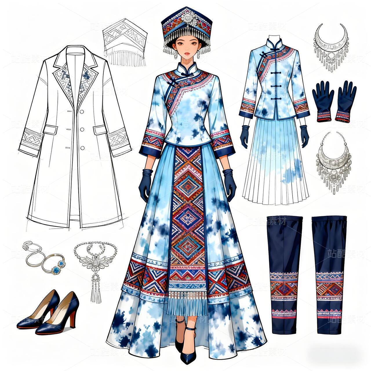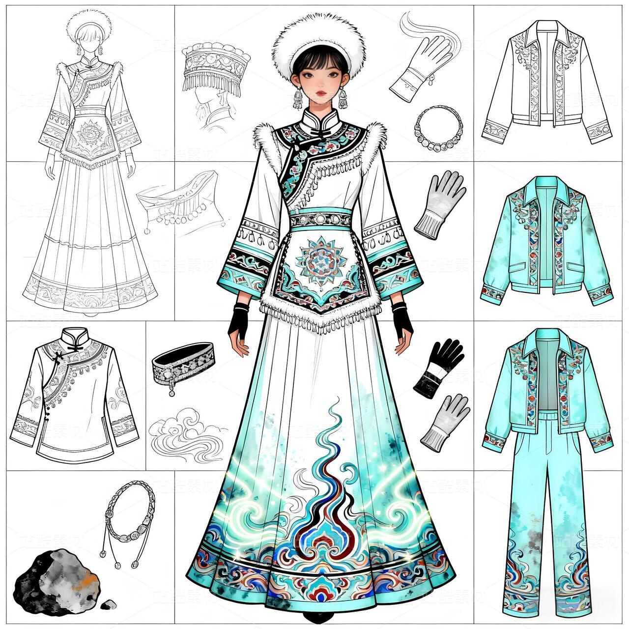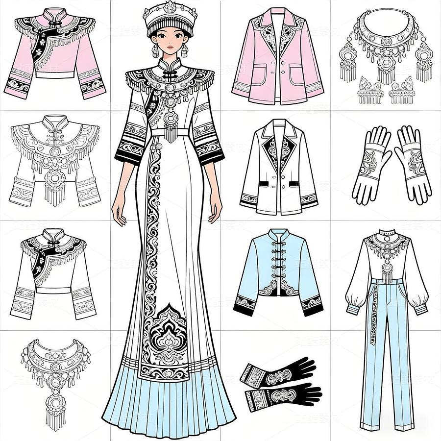 本系列高定礼服以“风月同天”为设计主题,巧妙解构白族非遗文化与敦煌艺术精华。主体采用象征白族纯洁的浅粉(寓意上关风花)、浅蓝(象征下关洱海)与奠定高级感的浅黑,形成既柔和又强烈的视觉对比。礼服廓形汲取白族服饰的端庄线条,并融入敦煌飞天流畅的飘逸感,通过不对称斜襟、层叠薄纱与宽幅腰带展现现代结构美学。纹样设计是最大亮点:将白族扎染的冰裂纹理、少女头饰的风花雪月图案,与敦煌璎珞纹样的繁复华丽、卷草线条相结合,以精细刺绣与立体烫金工艺呈现于丝绸、薄纱与软缎之上。手套、腰饰与项圈均采用改良璎珞设计,缀以蓝粉晶石,宛如从壁画中走来。此系列不仅是服饰,更是一场跨越山海的文明对话,让古老非遗在当代高定中焕发璀璨生命力。