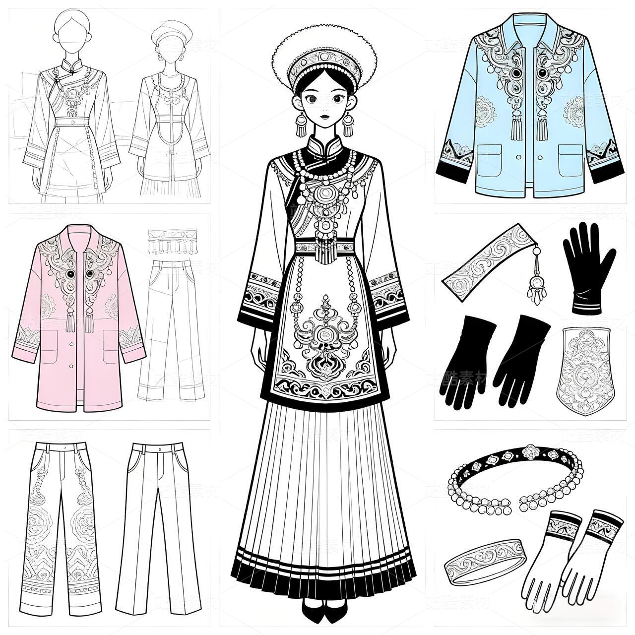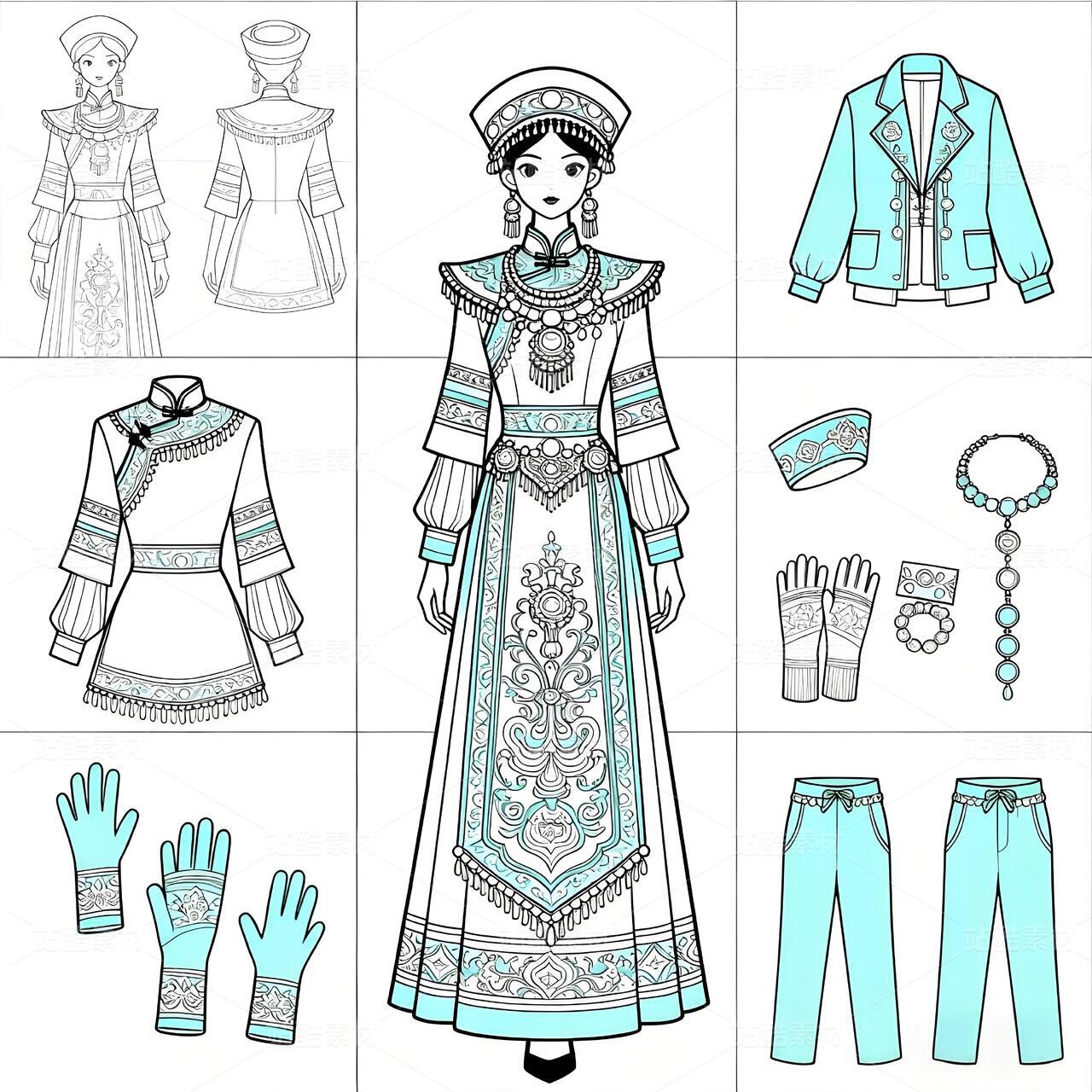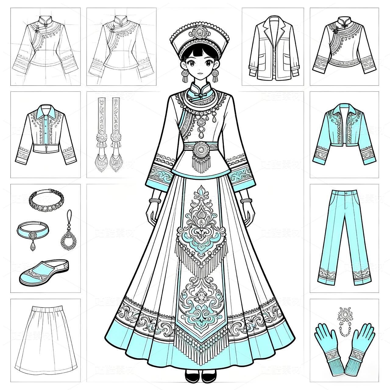 本系列高定礼服以“风月同天”为设计主题,巧妙解构白族非遗文化与敦煌艺术精华。主体采用象征白族纯洁的浅粉(寓意上关风花)、浅蓝(象征下关洱海)与奠定高级感的浅黑,形成既柔和又强烈的视觉对比。礼服廓形汲取白族服饰的端庄线条,并融入敦煌飞天流畅的飘逸感,通过不对称斜襟、层叠薄纱与宽幅腰带展现现代结构美学。纹样设计是最大亮点:将白族扎染的冰裂纹理、少女头饰的风花雪月图案,与敦煌璎珞纹样的繁复华丽、卷草线条相结合,以精细刺绣与立体烫金工艺呈现于丝绸、薄纱与软缎之上。手套、腰饰与项圈均采用改良璎珞设计,缀以蓝粉晶石,宛如从壁画中走来。此系列不仅是服饰,更是一场跨越山海的文明对话,让古老非遗在当代高定中焕发璀璨生命力。