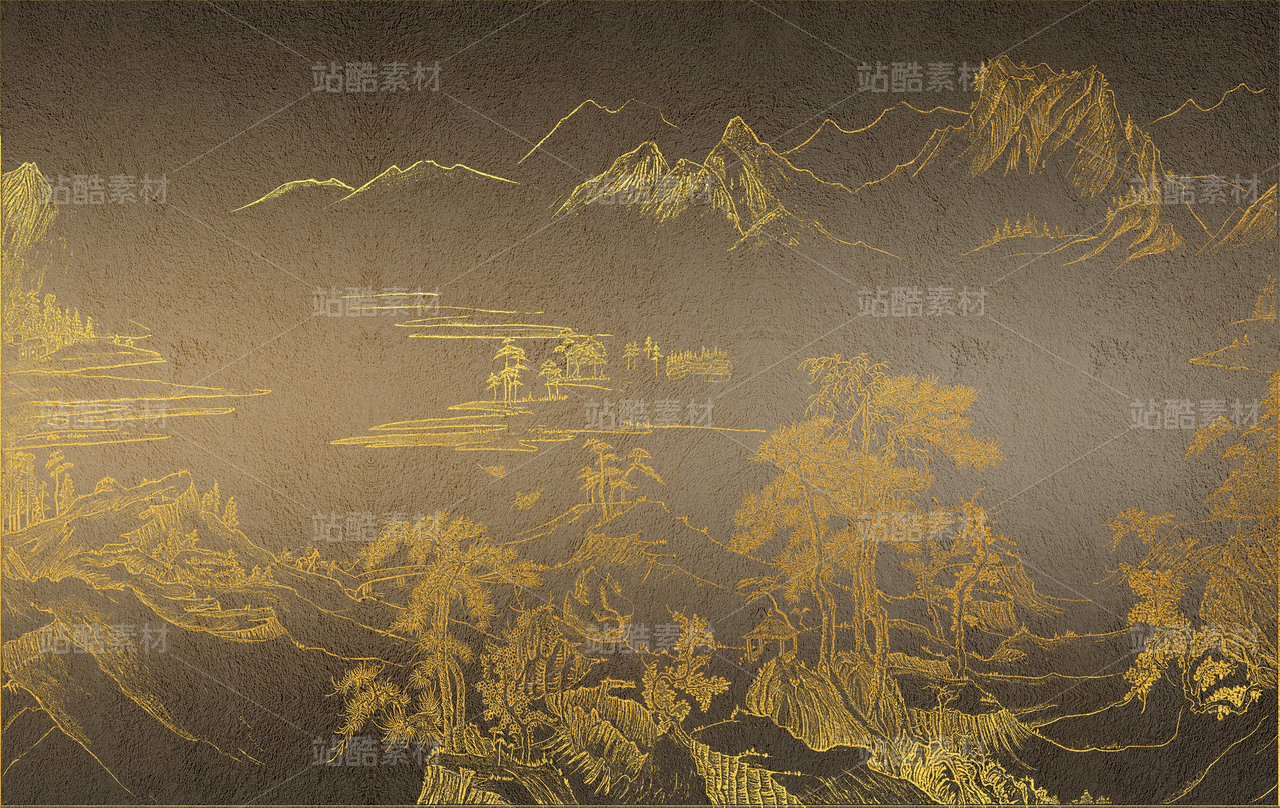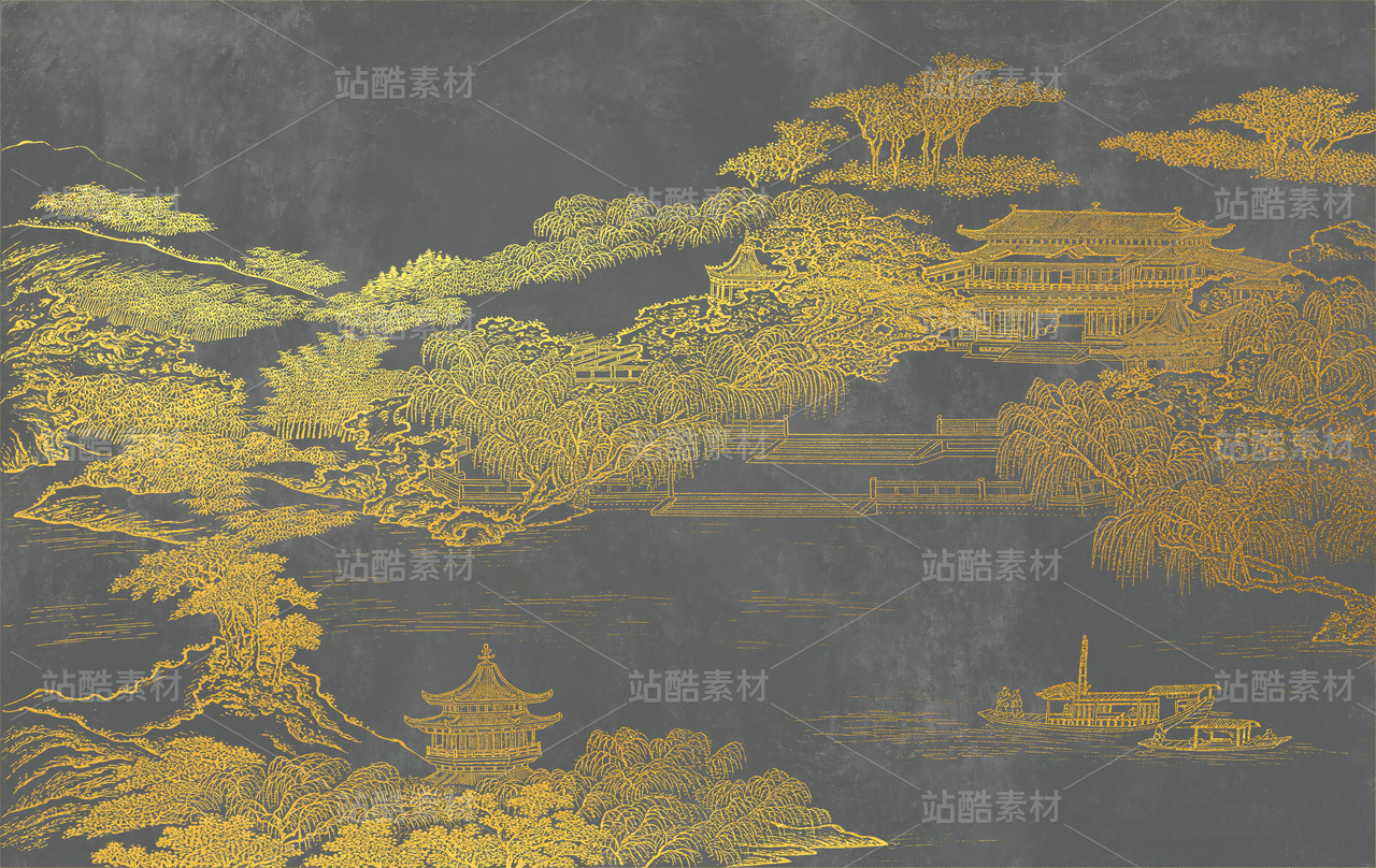 新中式国风亭台楼阁建筑工装背景墙壁画