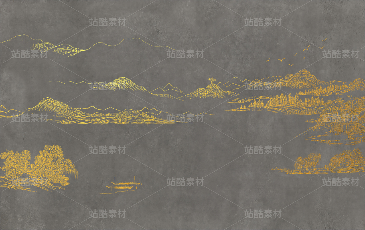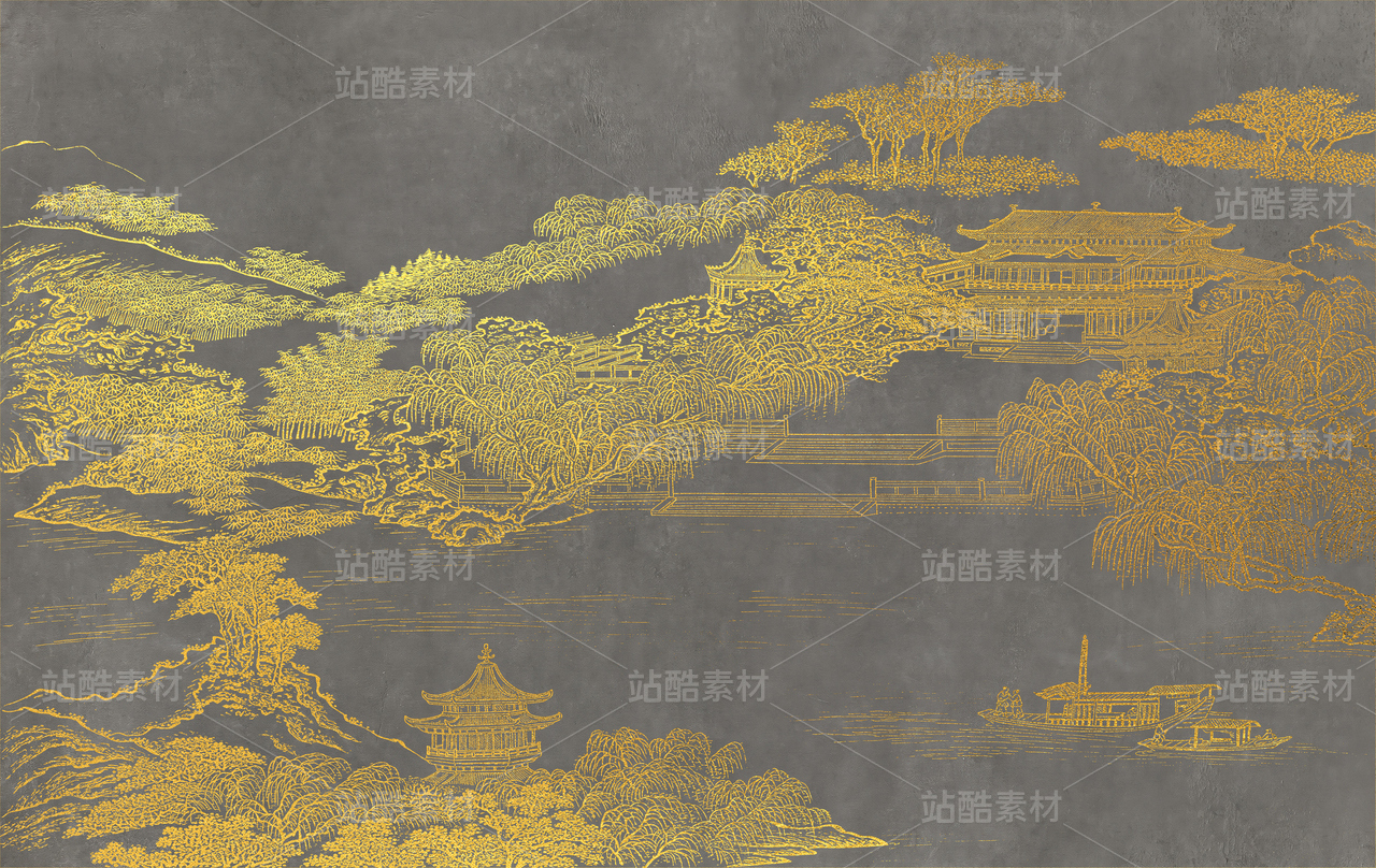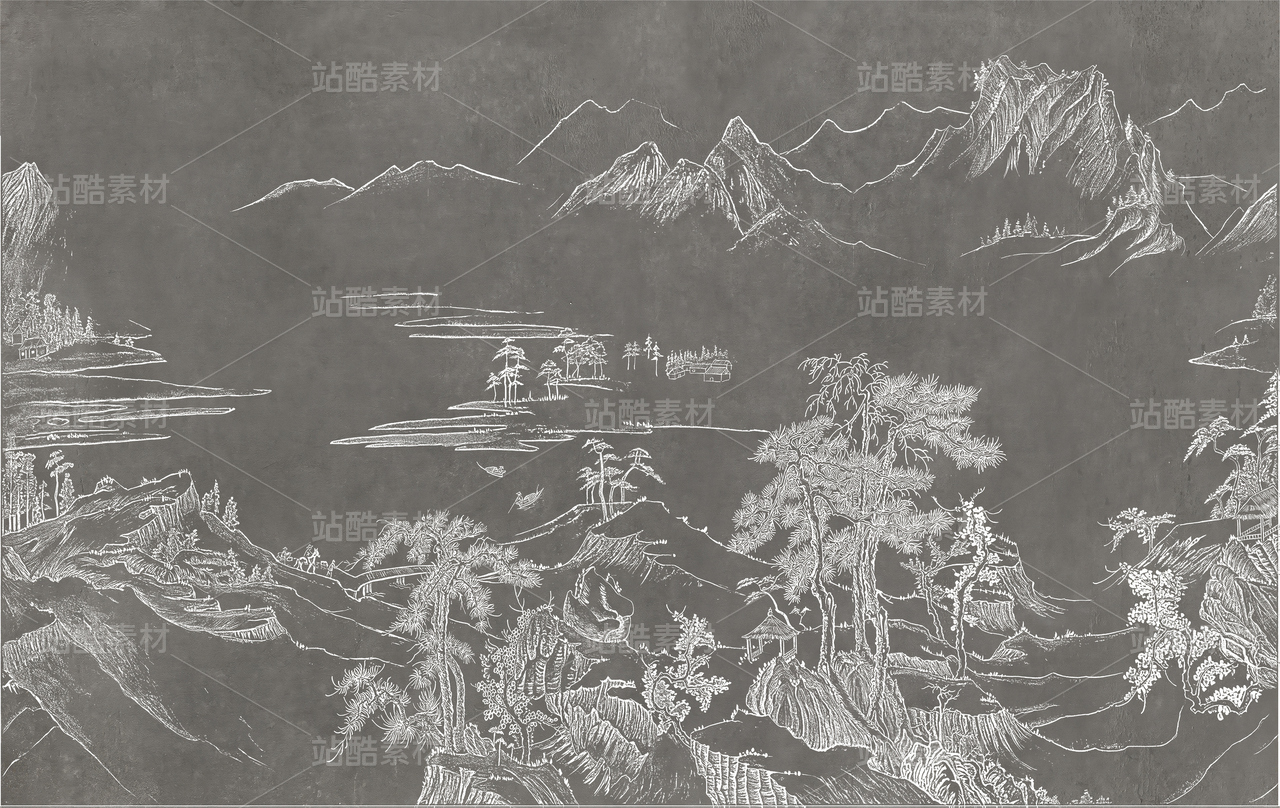 高清新款灰绿亭台楼阁新中式工装背景墙04