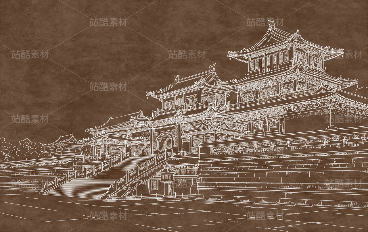 高清新款肌理亭台楼阁新中式工装背景墙01