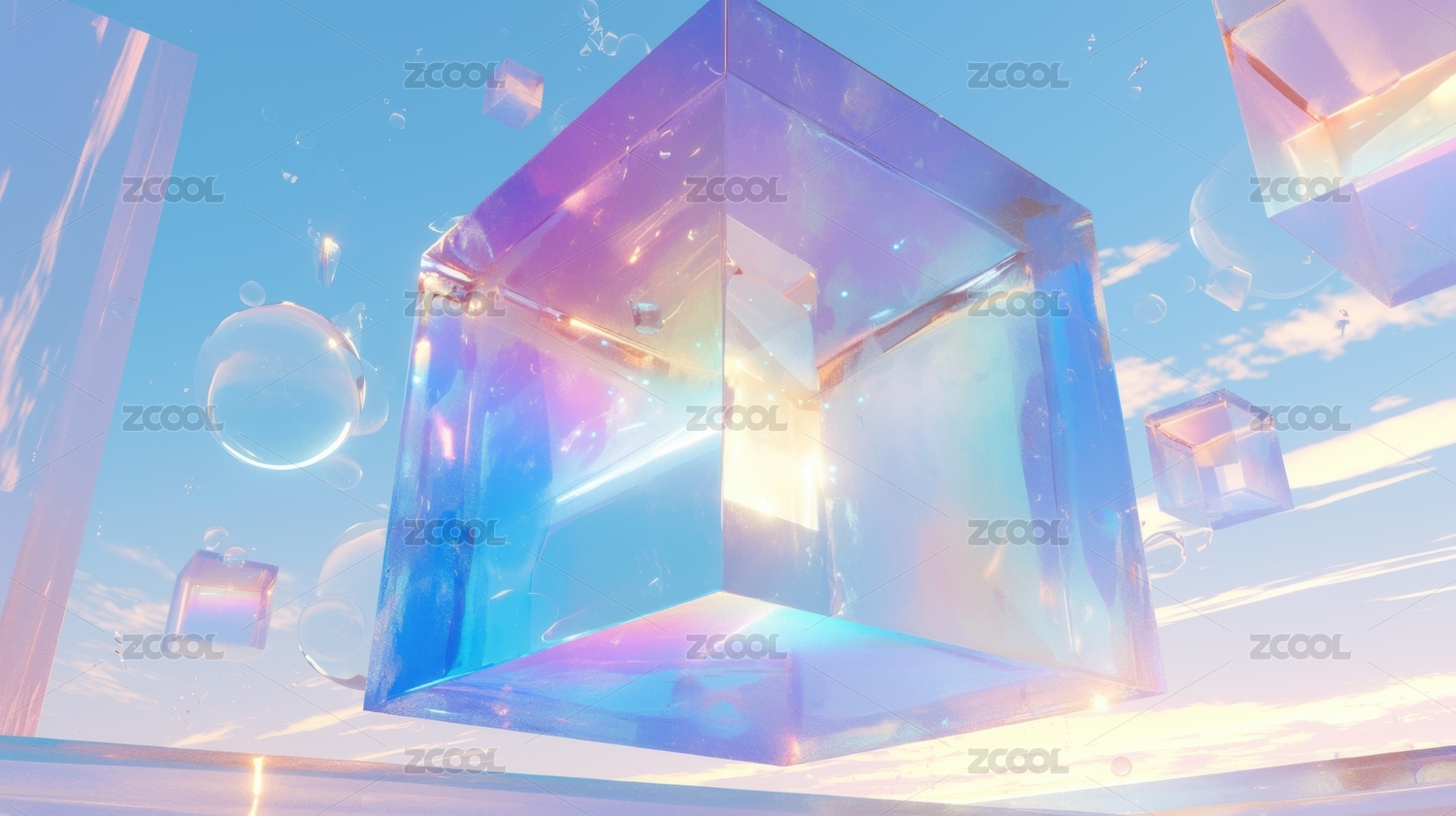 透明立方体在梦幻天空中的悬浮景象