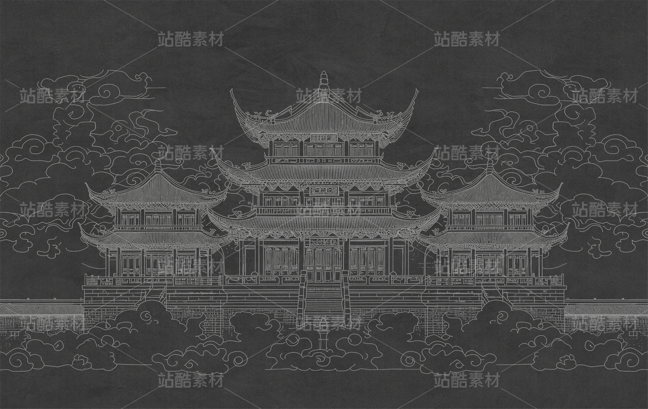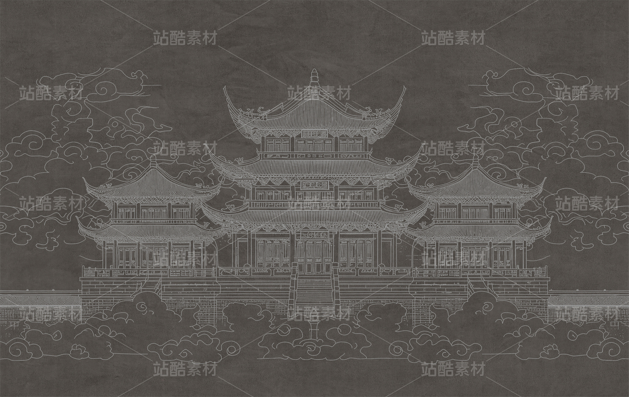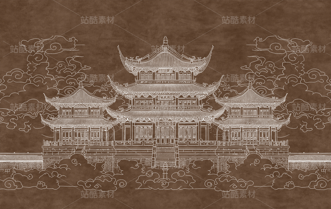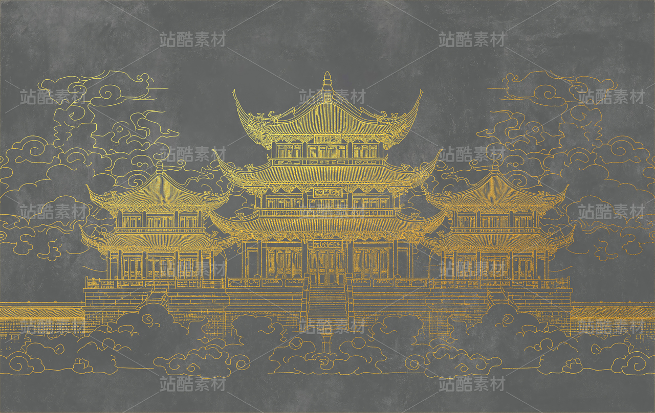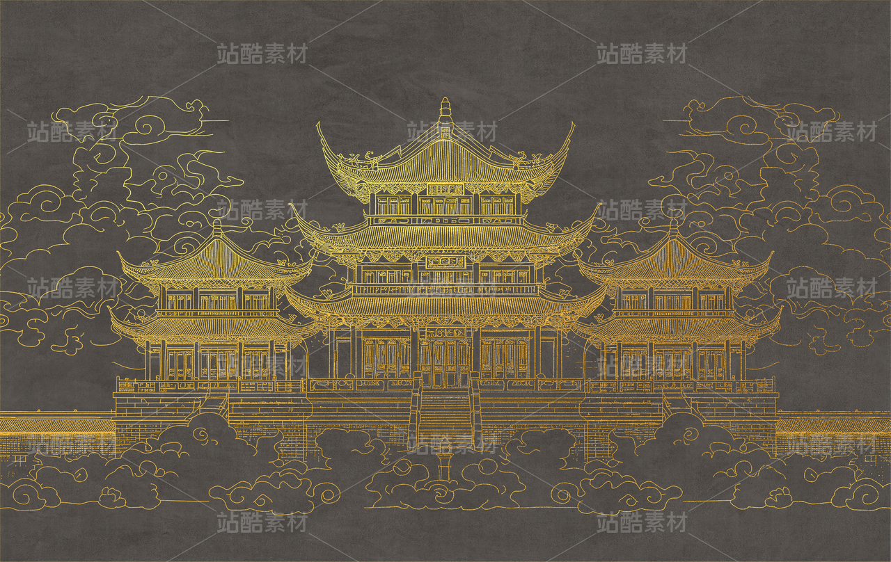 新中式国风亭台楼阁建筑工装背景墙壁画