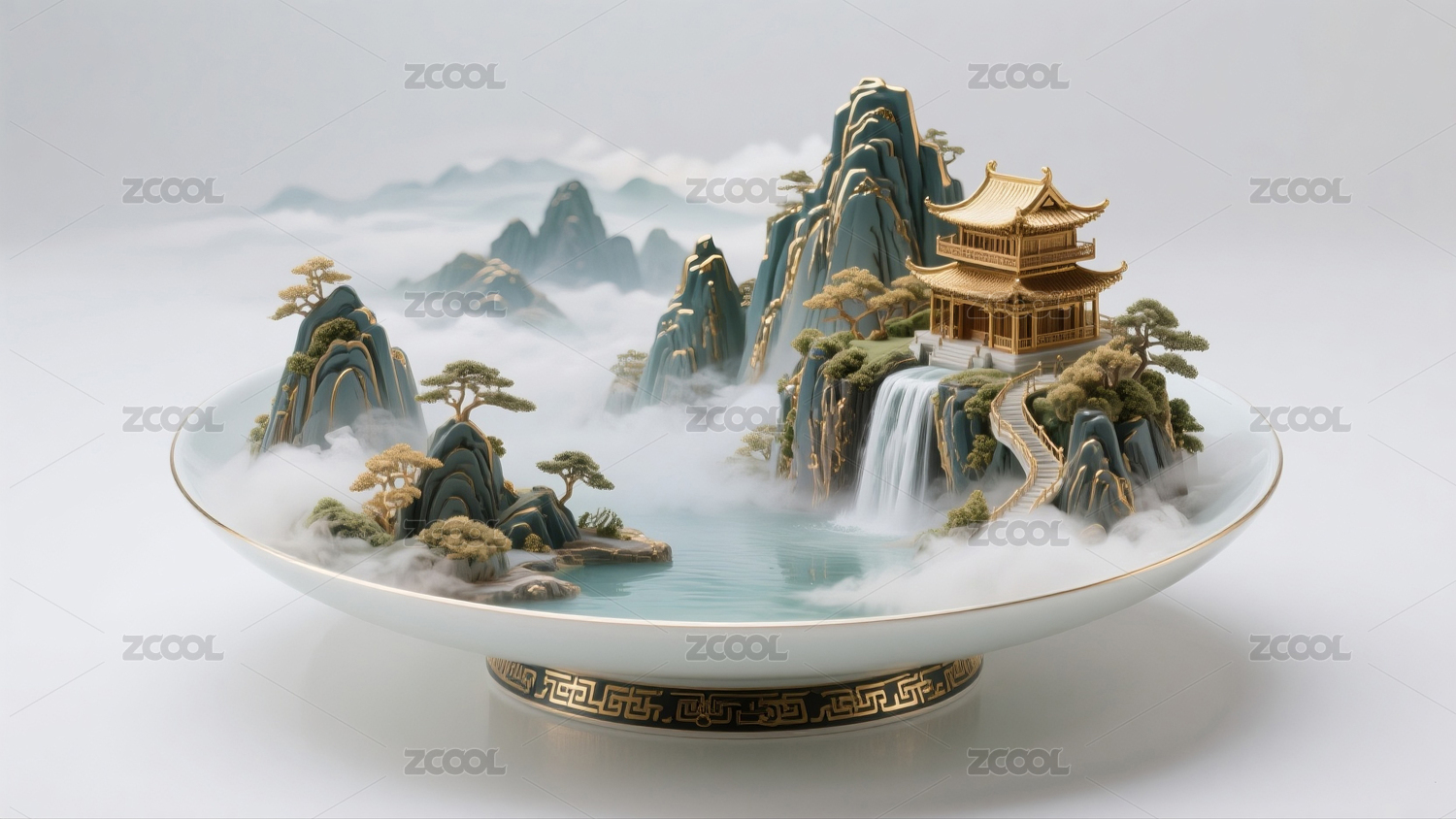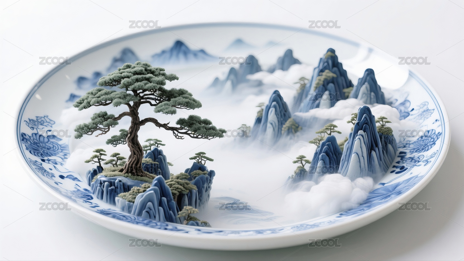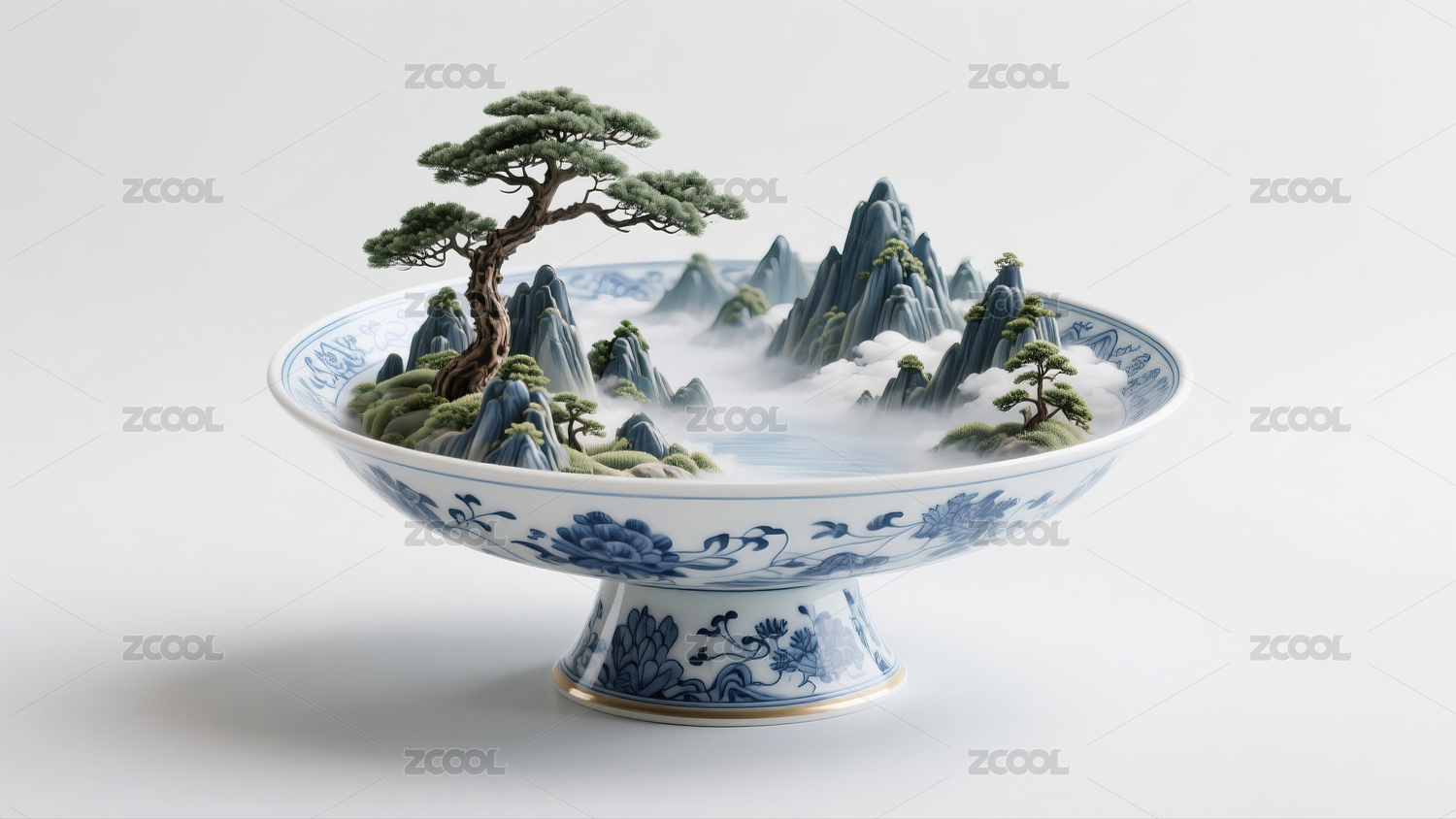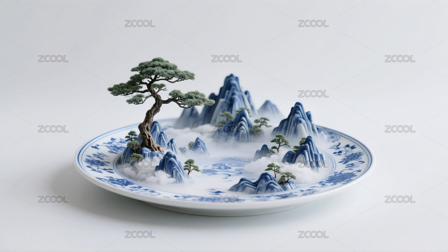国风,微缩,山水,山脉,古建筑,庭院,瓷器,青花瓷,3d,插画