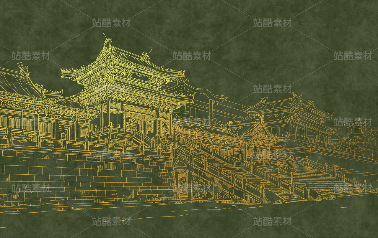 高清新款绿色绒布亭台楼阁新中式工装背景墙01