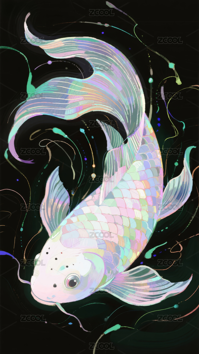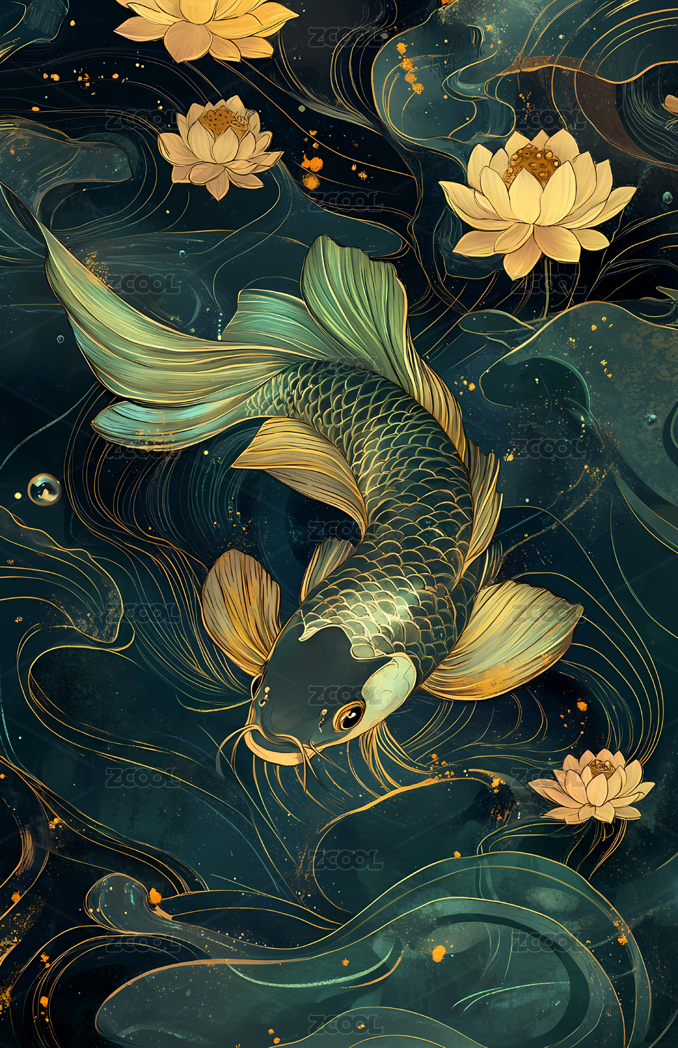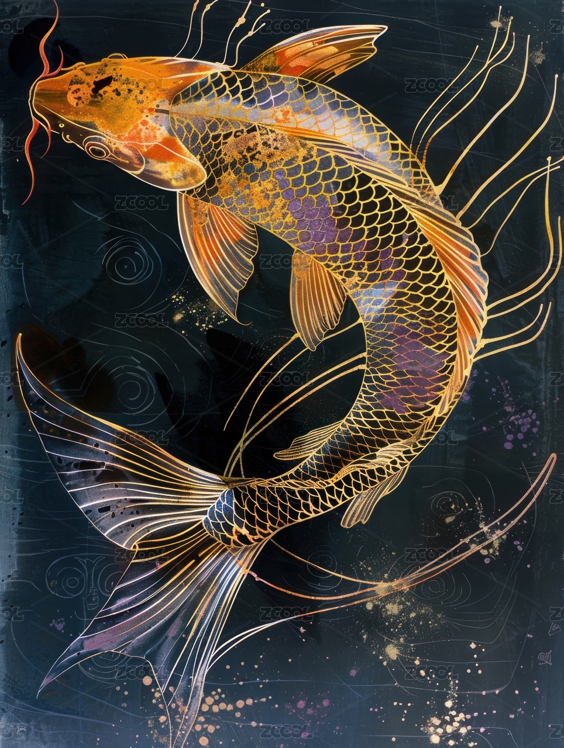 黑色背景上金色线条勾画出的锦鲤造型插画